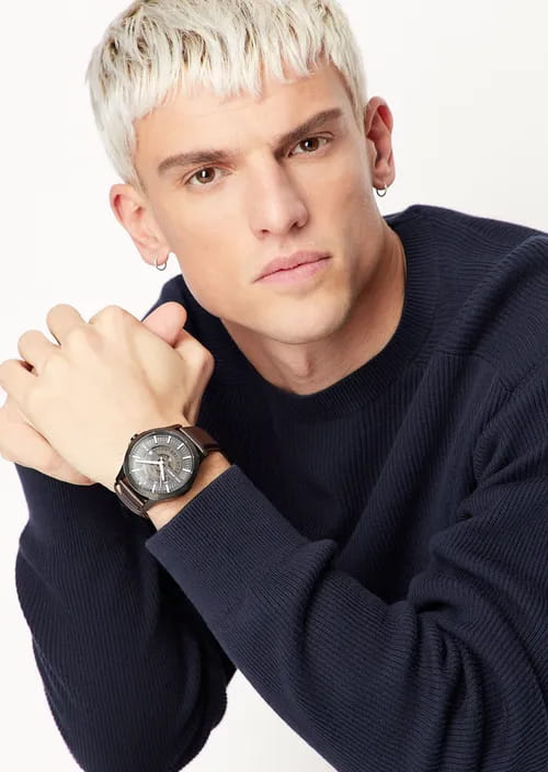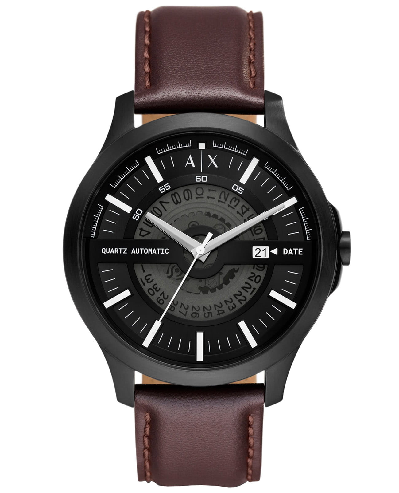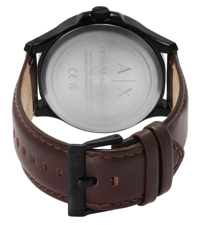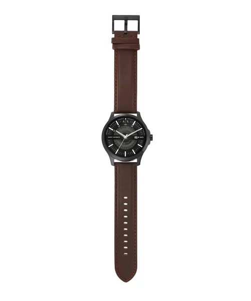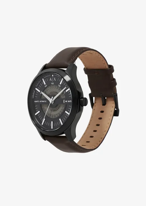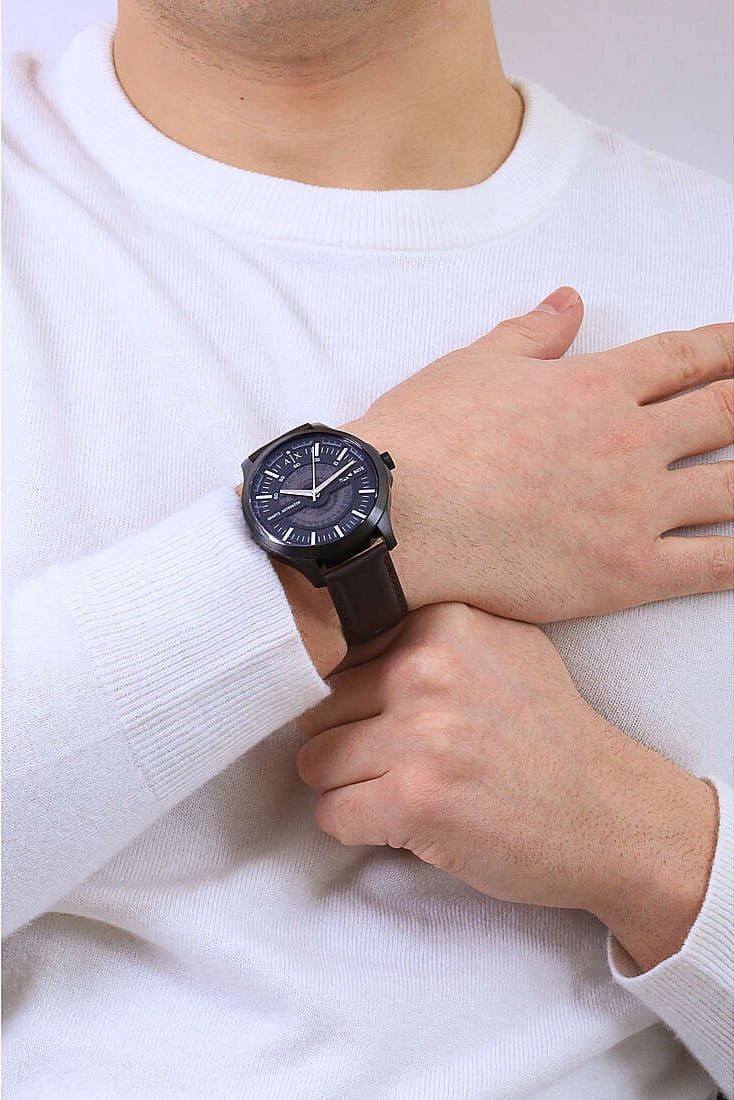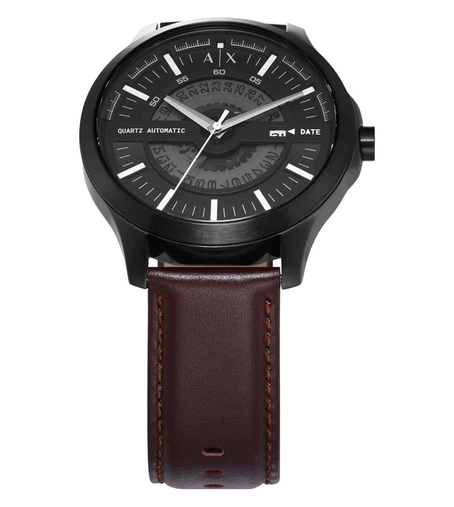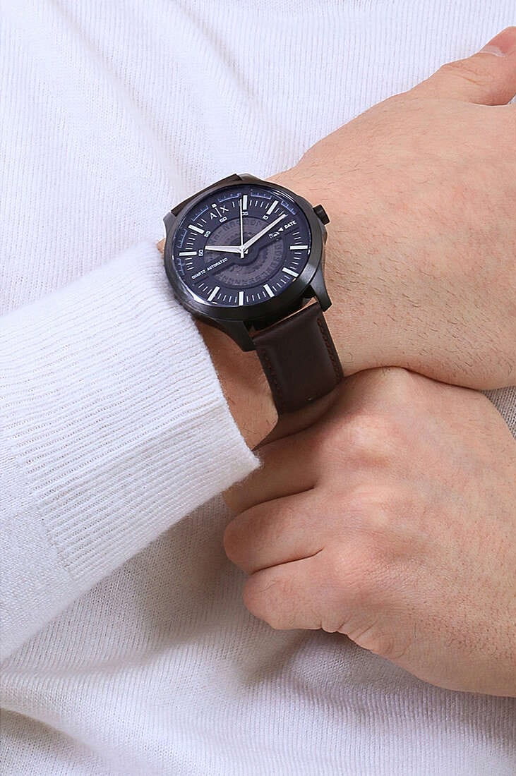 Мужские наручные часы с минеральным стекломМинеральное стеклоМинеральное стекло представляет собой искусственно выращенный минерал кварца. Такое стекло отличается особой устойчивостью к повреждениям и царапинам. Уступает по некоторым качествам сапфировому стеклу. Armani Exchange Hampton AX2446, кварцевый механизм с высокой точностью. Класс водозащиты: 50 метров, позволит защитить корпус от случайных брызг или капель дождя. Корпус часов изготовлен из стали с черным IP-покрытиемIP-покрытиеМетод ионного напыления. Демонстрирует повышенную устойчивость к истиранию, окислению и химическим веществам. Под воздействием высокого давления и температуры около 1500°C молекулы металла надёжно соединяются с частицами корпуса часов.. Кожаный ремешок на стандартной застёжке. Метки в виде штрихов. Окошко даты в положении 3 часа.