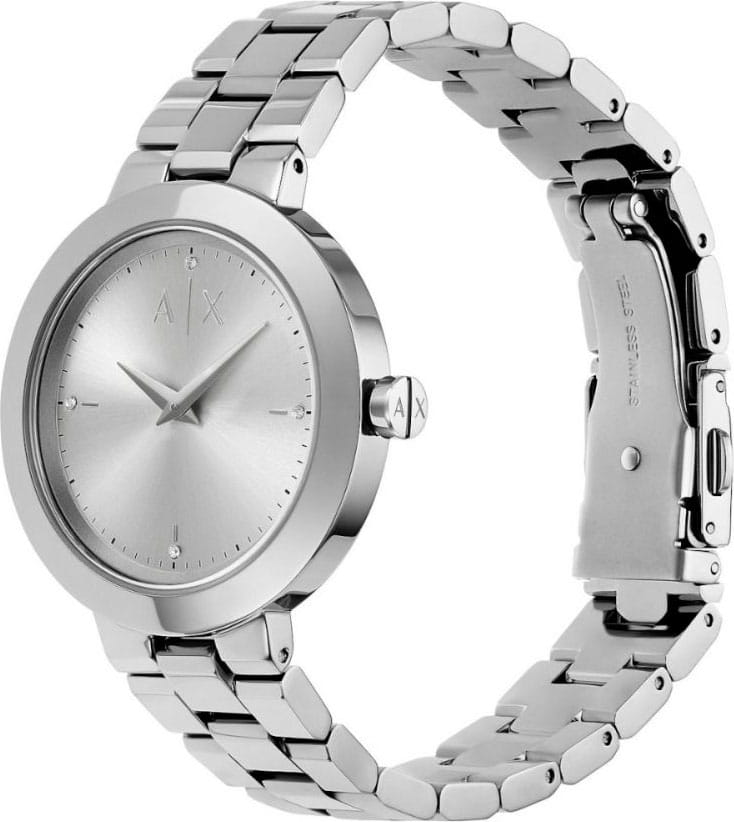 Женские часы Armani Exchange Jackie AX5170 — стильный аксессуар, который подчеркнет ваш современный образ. Эти кварцевые часы сочетают в себе утонченность и практичность, идеально подходя для ежедневного ношения. Корпус из нержавеющей стали, диаметром 36 мм и толщиной 6 мм создают элегантный и стойкий к царапинам вид, а также серебристый циферблат придает часам изысканность и универсальность. Минеральное стеклоМинеральное стеклоМинеральное стекло представляет собой искусственно выращенный минерал кварца. Такое стекло отличается особой устойчивостью к повреждениям и царапинам. Уступает по некоторым качествам сапфировому стеклу. защищает их от царапин и повреждений, сохраняя первозданный вид даже при активном использовании. Стальной браслет на раскладной застёжкеРаскладная застёжкаТакой тип застёжки используется только на браслетах из металла. Она никогда не раскрывается полностью, происходит разделение на 2 и более частей. Раскладывающая застёжка снизит вероятность потери часов к минимуму. обеспечивает надежную фиксацию на запястье. Циферблат выполнен по технологии Sunray (солнечные лучи) и украшен кристаллами. Метки в виде штрихов. Водозащита 50WR позволяет защитить часы от случайных брызг воды.