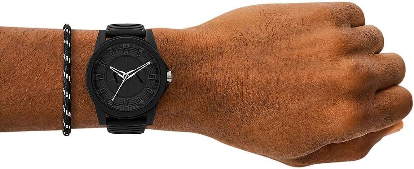 Часы Armani Exchange Outerbanks AX7159SET — это стильный аксессуар, идеально подходящий для тех, кто ведет активный и насыщенный образ жизни. Эти часы характеризуются мужским дизайном и выделяется своей функциональностью. Корпус и безельБезельВнешний ободок, закрепляющий стекло. В спортивных часах так называется поворотное кольцо с делениями на циферблате, выполняет роль таймера – замеряет отрезки времени на шкале. Неподвижный безель – элемент декора. Однонаправленно вращающийся безель на дайверских часах позволяет фиксировать моменты погружения и выныривания на поверхность. выполнены прочного нейлона, что придает им современный и изысканный вид. Защиту черного циферблата обеспечивает минеральное стеклоМинеральное стеклоМинеральное стекло представляет собой искусственно выращенный минерал кварца. Такое стекло отличается особой устойчивостью к повреждениям и царапинам. Уступает по некоторым качествам сапфировому стеклу., которое устойчиво к царапинам и сохраняет прозрачность на протяжении всего срока службы. Черный силиконовый ремешок со стандартной классической застежкой обеспечивает комфорт и надежную фиксацию на запястье. В комплект также входит дополнительный ремешок и текстиля, позволяющий легко изменить стиль и подчеркнуть индивидуальность. Часы обладают водозащитой 50WR, что делает их надежными в различных условиях.