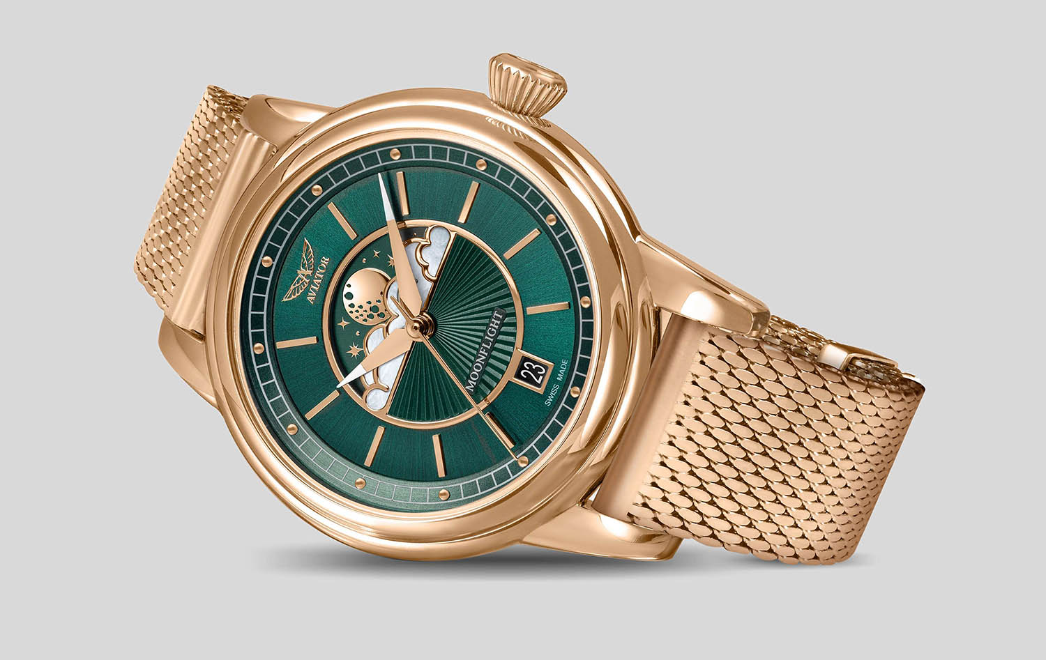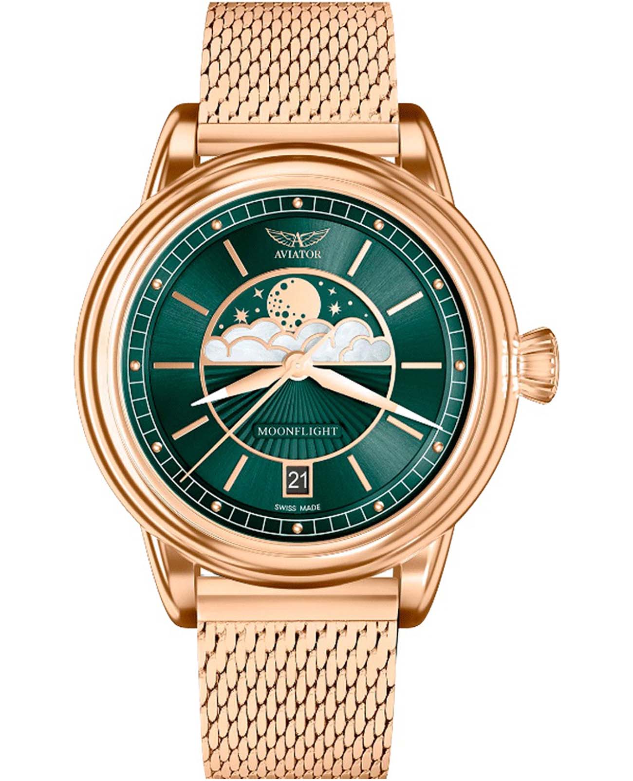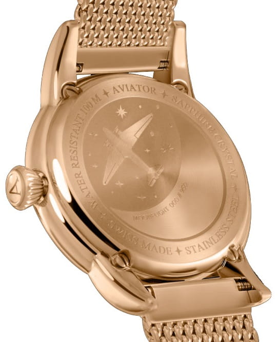 Aviator Douglas MoonFlight V.1.33.2.263.5 — элегантные дамские швейцарские часы с утончённой авиационной эстетикой. Корпус 36 мм из нержавеющей стали 316L с PVD-покрытиемPVDУльтратонкое покрытие наносится в технике вакуумного напыления, сочетает в себе нитрид титана особой прочности со слоем золота или оксида хрома. Несёт в себе декоративную или защитную функцию. обладает компактными пропорциями и удобным профилем. Циферблат в стиле Art Deco украшает усложнение фаз Луны в верхней половине, обрамлённой тонким кольцом облаков. Отмечено окно даты в положении «6 часов». Стрелки обработаны люминесцентным покрытиемЛюминесцентное покрытиеПозволяет считывать показания времени в темноте. Производители наносят на стрелки, часовые индексы, безель или поверхность циферблата светонакопительный состав, дающий холодное свечение. Superluminova — для уверенного считывания в темноте. Поверхность защищена сапфировым стекломСапфировое стеклоПрочный и надёжный материал из кристалла сапфира синтетического происхождения, характеризующийся особой твёрдостью и устойчивостью к царапинам и повреждениям. с антибликовым покрытиемАнтибликовое покрытиеСлой оксида металла в 0,13-0,3 микрон, благодаря которому стекло часов не бликует и не отражает свет. Антибликовое покрытие уменьшает отражение света в 10 раз, обеспечивая отличную читаемость показателей циферблата.. Сердце модели — швейцарский кварцевый механизм Ronda 708 с функцией отображения лунных фаз, 13 рубинами и возможностью работать до 54 месяцев без замены батареи. Завинчивающаяся задняя крышка с гравировкой Douglas DC-3 и герметичность до 100 метров создают надёжную основу для эксплуатации. Стальной браслет с PVD-покрытиемPVDУльтратонкое покрытие наносится в технике вакуумного напыления, сочетает в себе нитрид титана особой прочности со слоем золота или оксида хрома. Несёт в себе декоративную или защитную функцию. миланского плетения на раскладном замкеРаскладной замокДанный вариант застежки используется только на часах с металлическим браслетом. Отличительная особенность такого крепления в том, что длина браслета становится универсальной и вы можете самостоятельно отрегулировать нужный вам размер – застежка просто двигается по браслету часов., сочетая комфорт, элегантность и практичность. Лимитированная серия. Aviator Douglas MoonFlight — это гармоничное сочетание авиационного наследия, женской элегантности и технической изысканности, воплощённое в элегантном и функциональном аксессуаре.