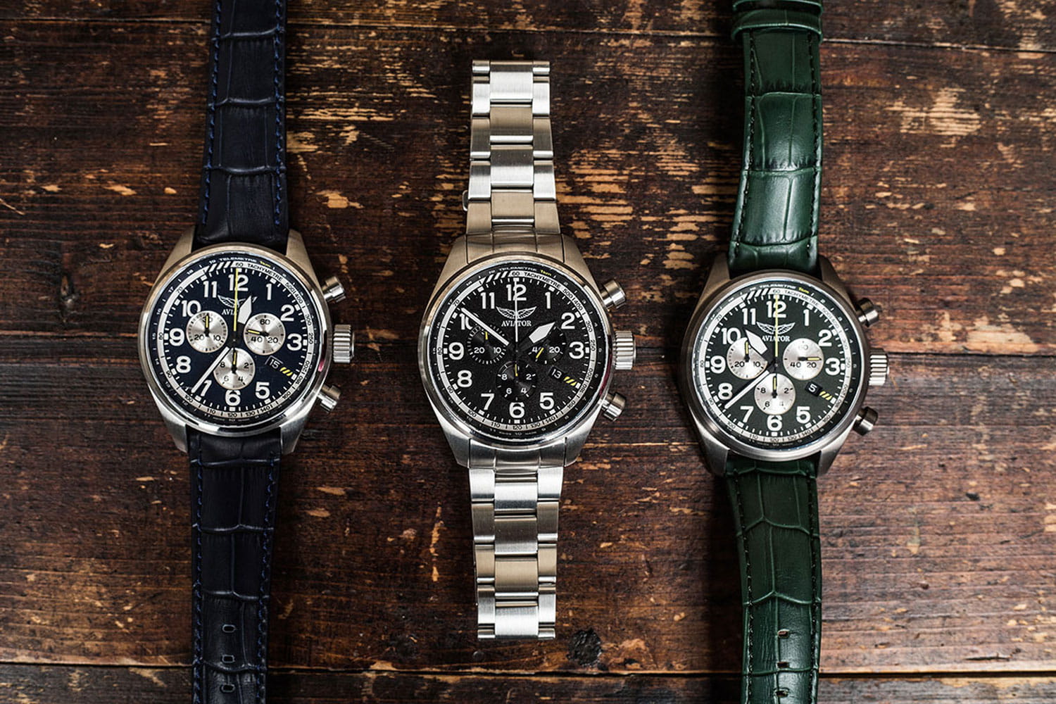 Циферблат оформлен в классическом aviator-стиле: крупные арабские цифры, широкие стрелки и чёткое деление минут позволяют считывать время мгновенно. Стрелки и метки покрыты люминесцентным покрытиемЛюминесцентное покрытиеПозволяет считывать показания времени в темноте. Производители наносят на стрелки, часовые индексы, безель или поверхность циферблата светонакопительный состав, дающий холодное свечение. для отличной читаемости при слабом освещении.