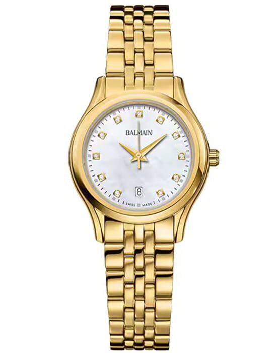 Женские часы Balmain Beleganza B8340.33.86 кварцевый механизм с высокой точностью. Сапфировое стеклоСапфировое стеклоПрочный и надёжный материал из кристалла сапфира синтетического происхождения, характеризующийся особой твёрдостью и устойчивостью к царапинам и повреждениям. устойчивое к появлению царапин, обладающее высокой прозрачностью. Корпус изготовлен из нержавеющей стали PVD-покрытиемPVDУльтратонкое покрытие наносится в технике вакуумного напыления, сочетает в себе нитрид титана особой прочности со слоем золота или оксида хрома. Несёт в себе декоративную или защитную функцию.. Класс водозащиты: 50 метров, позволит защитить корпус от случайных брызг или капель дождя. Стальной браслет с PVD-покрытиемPVDУльтратонкое покрытие наносится в технике вакуумного напыления, сочетает в себе нитрид титана особой прочности со слоем золота или оксида хрома. Несёт в себе декоративную или защитную функцию.. на застёжке «бабочка» с кнопкамиЗастёжка "бабочка"Такой вид застёжки дополняется предохранителями, помогающими избежать случайного раскрытия браслета. Обладают изящным исполнением. . БезельБезельВнешний ободок, закрепляющий стекло. В спортивных часах так называется поворотное кольцо с делениями на циферблате, выполняет роль таймера – замеряет отрезки времени на шкале. Неподвижный безель – элемент декора. Однонаправленно вращающийся безель на дайверских часах позволяет фиксировать моменты погружения и выныривания на поверхность. с PVD-покрытиемPVDУльтратонкое покрытие наносится в технике вакуумного напыления, сочетает в себе нитрид титана особой прочности со слоем золота или оксида хрома. Несёт в себе декоративную или защитную функцию.. Календарь в положении 6 часов. Циферблат с 11 бриллиантами группы Top Wesselton VS-SI общим весом 0.041 карата