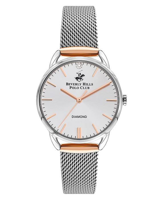 Американские женские часы с минеральным стеклом Beverly Hills Polo Club BP3299C.330 с минеральным стекломМинеральное стеклоМинеральное стекло представляет собой искусственно выращенный минерал кварца. Такое стекло отличается особой устойчивостью к повреждениям и царапинам. Уступает по некоторым качествам сапфировому стеклу., кварцевый механизм с высокой точностью. Класс водозащиты: 30 метров, позволит защитить корпус от случайных брызг или капель дождя. Корпус и браслет часов изготовлены из стали с частичным IP-покрытиемIP-покрытиеМетод ионного напыления. Демонстрирует повышенную устойчивость к истиранию, окислению и химическим веществам. Под воздействием высокого давления и температуры около 1500°C молекулы металла надёжно соединяются с частицами корпуса часов., розового золота. Браслет с раскладной застёжкойРаскладная застёжкаТакой тип застёжки используется только на браслетах из металла. Она никогда не раскрывается полностью, происходит разделение на 2 и более частей. Раскладывающая застёжка снизит вероятность потери часов к минимуму..