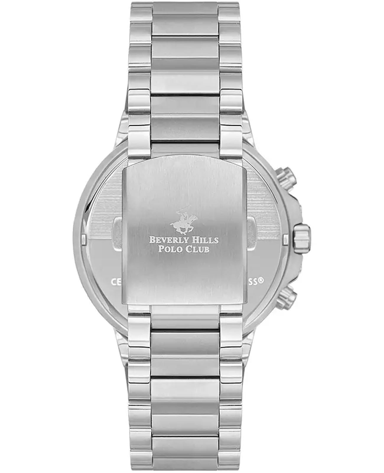 Американские мужские часы-хронографХронографФункция позволяет измерять отрезки времени с особой точностью: часы, минуты, секунды. Верным признаком хронографа является наличие на циферблате 3 дополнительных окошек-счётчиков. Beverly Hills Polo Club BP3540X.380 с минеральным стекломМинеральное стеклоМинеральное стекло представляет собой искусственно выращенный минерал кварца. Такое стекло отличается особой устойчивостью к повреждениям и царапинам. Уступает по некоторым качествам сапфировому стеклу., кварцевый механизм с высокой точностью. Класс водозащиты: 50 метров, позволит защитить корпус от случайных брызг или капель дождя. Стальной браслет на раскладной застёжкойРаскладная застёжкаТакой тип застёжки используется только на браслетах из металла. Она никогда не раскрывается полностью, происходит разделение на 2 и более частей. Раскладывающая застёжка снизит вероятность потери часов к минимуму.. Окошко даты находится в положении между 4 и 5 часов. На отдельных циферблатах отражены день недели, 24-х часовой формат времени и второй часовой поясВторой часовой поясФункция, позволяющая отображать время двух часовых поясов одновременно.. Стрелки и метки с люминесцентным покрытиемЛюминесцентное покрытиеПозволяет считывать показания времени в темноте. Производители наносят на стрелки, часовые индексы, безель или поверхность циферблата светонакопительный состав, дающий холодное свечение.. Вращающийся безельБезельВнешний ободок, закрепляющий стекло. В спортивных часах так называется поворотное кольцо с делениями на циферблате, выполняет роль таймера – замеряет отрезки времени на шкале. Неподвижный безель – элемент декора. Однонаправленно вращающийся безель на дайверских часах позволяет фиксировать моменты погружения и выныривания на поверхность. с IP-покрытиемIP-покрытиеМетод ионного напыления. Демонстрирует повышенную устойчивость к истиранию, окислению и химическим веществам. Под воздействием высокого давления и температуры около 1500°C молекулы металла надёжно соединяются с частицами корпуса часов..