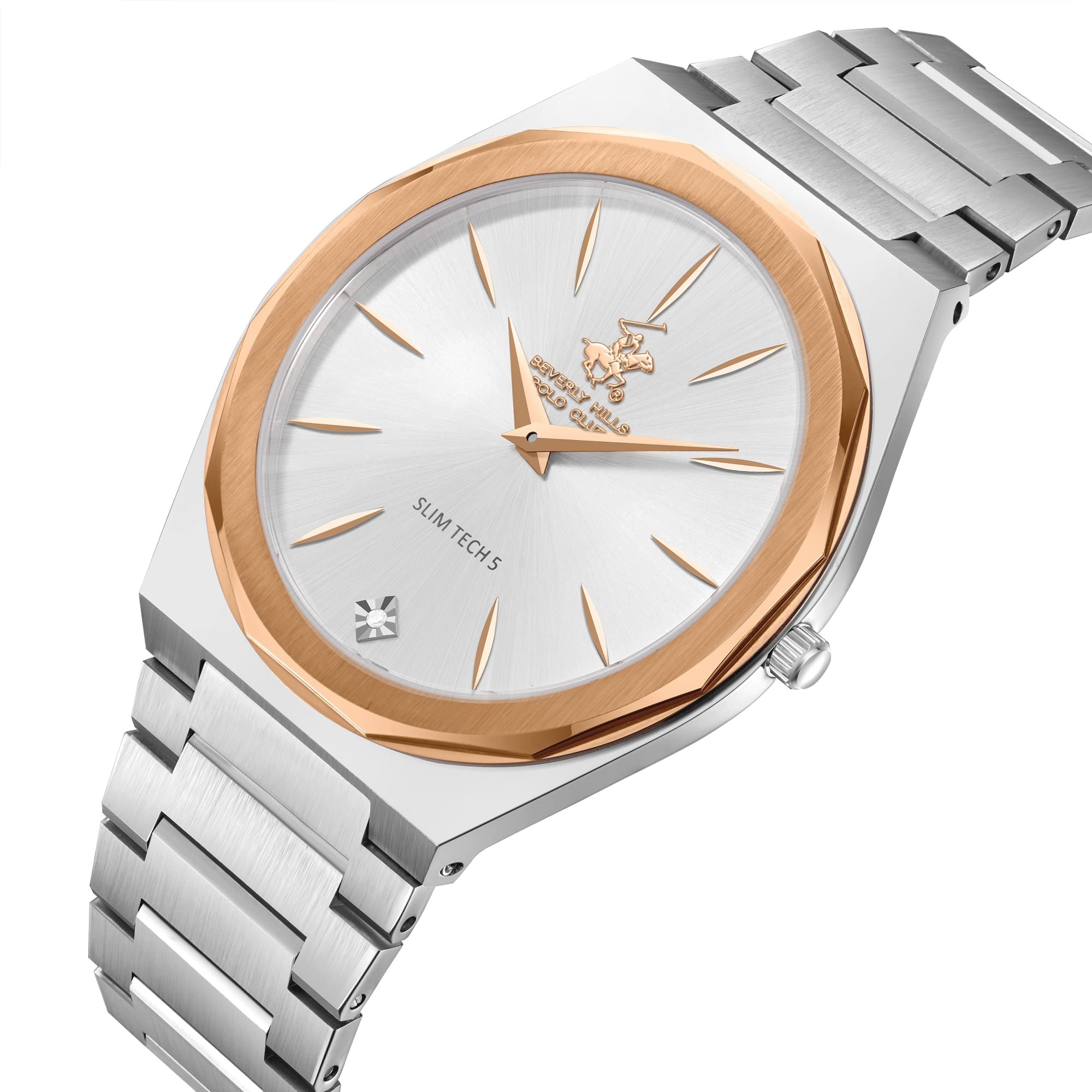 Часы Beverly Hills Polo Club BP3667X.330 — это гармоничное сочетание силы, стиля и современных технологий. Выполненные из высококачественной нержавеющей стали, минеральное стеклоМинеральное стеклоМинеральное стекло представляет собой искусственно выращенный минерал кварца. Такое стекло отличается особой устойчивостью к повреждениям и царапинам. Уступает по некоторым качествам сапфировому стеклу., защищающее циферблат, надёжно оберегает его от царапин, сохраняя яркий блеск и украшен бриллиантом. БезельБезельВнешний ободок, закрепляющий стекло. В спортивных часах так называется поворотное кольцо с делениями на циферблате, выполняет роль таймера – замеряет отрезки времени на шкале. Неподвижный безель – элемент декора. Однонаправленно вращающийся безель на дайверских часах позволяет фиксировать моменты погружения и выныривания на поверхность. с PVD-покрытиемPVDУльтратонкое покрытие наносится в технике вакуумного напыления, сочетает в себе нитрид титана особой прочности со слоем золота или оксида хрома. Несёт в себе декоративную или защитную функцию.. С уровнем водозащиты до 100 метров, эти часы готовы сопровождать вас в любых водных приключениях: будь то плавание, ныряние или активные занятия спортом. Стальной браслет на застёжке-бабочке с кнопкамиЗастёжка "бабочка"Такой вид застёжки дополняется предохранителями, помогающими избежать случайного раскрытия браслета. Обладают изящным исполнением. . Эта модель — истинное воплощение философии Beverly Hills Polo Club: сочетание высоких стандартов качества и неподражаемого стиля, создающее аксессуар, который станет вашим верным компаньоном в повседневной жизни.