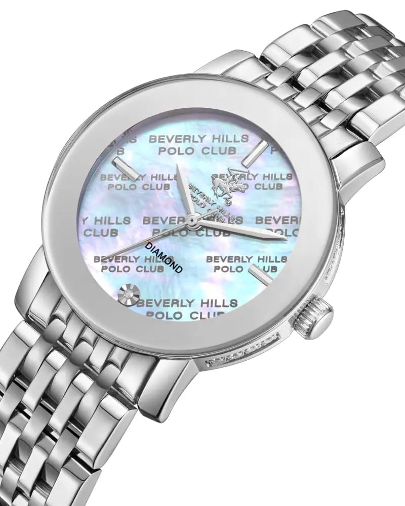Часы Beverly Hills Polo Club BP3670C.320 — элегантный женский аксессуар, сочетающий утончённый стиль и функциональность. Корпус диаметром 32 мм выполнен из нержавеющей стали серебристого цвета что придаёт часам роскошный вид. Перламутровый циферблат с изящными штрихами защищён минеральным стекломМинеральное стеклоМинеральное стекло представляет собой искусственно выращенный минерал кварца. Такое стекло отличается особой устойчивостью к повреждениям и царапинам. Уступает по некоторым качествам сапфировому стеклу., устойчивым к царапинам.