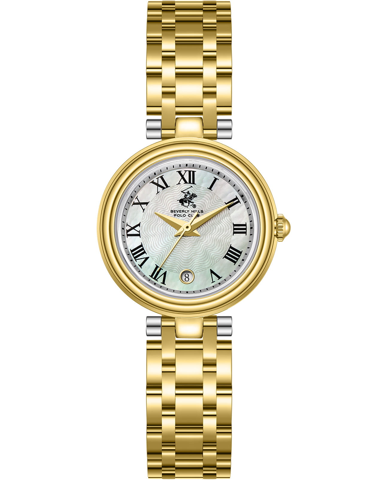 Женские кварцевые часы Beverly Hills Polo Club — это элегантный аксессуар. Корпус диаметром 26 мм выполнен из нержавеющей стали с IP-покрытиемIP-покрытиеМетод ионного напыления. Демонстрирует повышенную устойчивость к истиранию, окислению и химическим веществам. Под воздействием высокого давления и температуры около 1500°C молекулы металла надёжно соединяются с частицами корпуса часов. жёлтого золота. Циферблат оформлен индексами и стрелками. Окошко даты расположено в положении 6 часов. Циферблат защищён минеральным стекломМинеральное стеклоМинеральное стекло представляет собой искусственно выращенный минерал кварца. Такое стекло отличается особой устойчивостью к повреждениям и царапинам. Уступает по некоторым качествам сапфировому стеклу.. Часы оснащены стальным браслетом с IP-покрытиемIP-покрытиеМетод ионного напыления. Демонстрирует повышенную устойчивость к истиранию, окислению и химическим веществам. Под воздействием высокого давления и температуры около 1500°C молекулы металла надёжно соединяются с частицами корпуса часов. на застёжке «бабочка» с кнопкамиЗастёжка "бабочка"Такой вид застёжки дополняется предохранителями, помогающими избежать случайного раскрытия браслета. Обладают изящным исполнением. . Водонепроницаемость 30 м позволяет использовать часы в повседневных условиях. Идеальный выбор для тех, кто ценит стиль и качество.