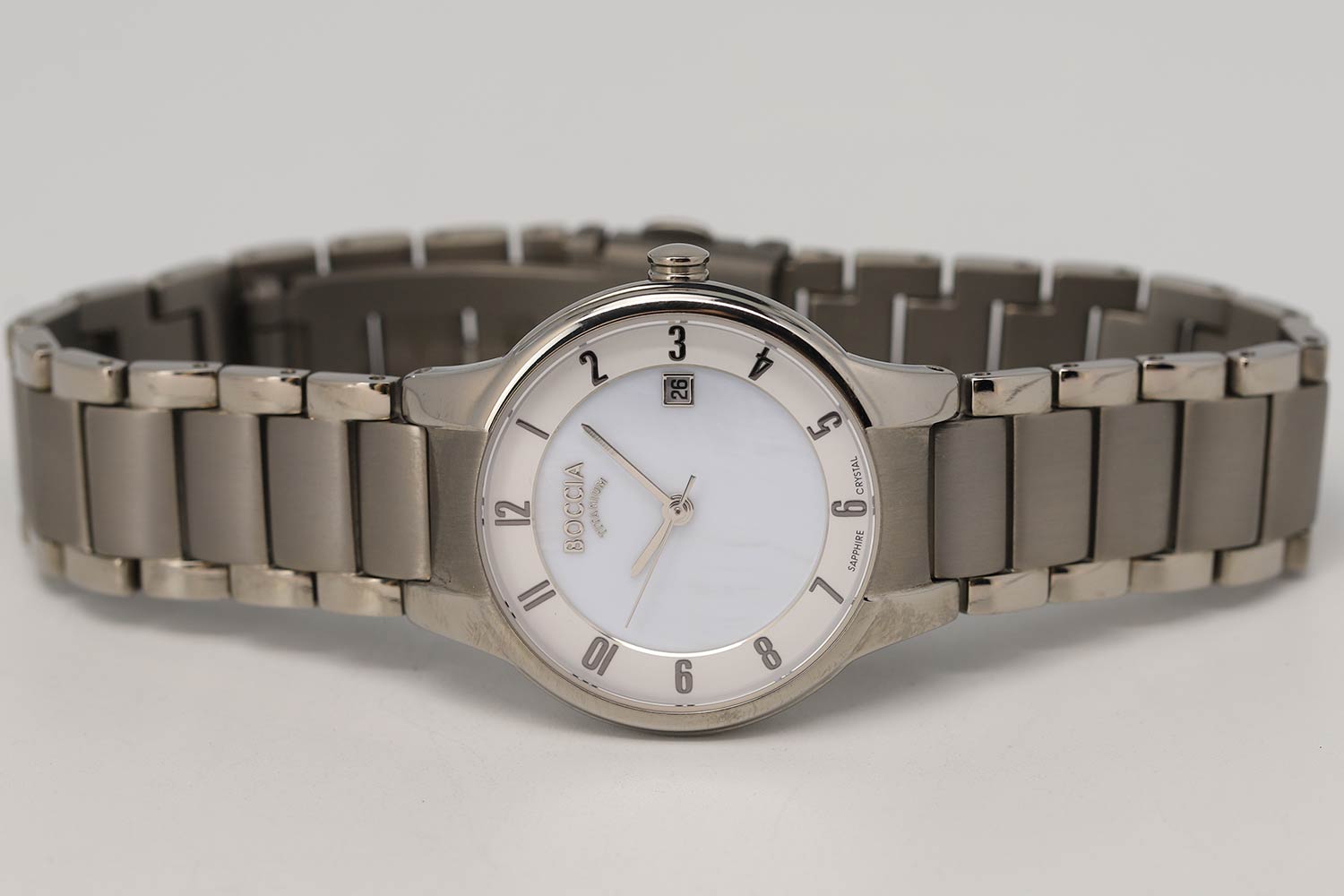 Женские немецкие титановые часы Boccia Titanium 3301-01 с надёжным кварцевым механизмом. Корпус изготовлен из титана диаметром 30мм подчеркивает современный дизайн модели. Сапфировое стеклоСапфировое стеклоПрочный и надёжный материал из кристалла сапфира синтетического происхождения, характеризующийся особой твёрдостью и устойчивостью к царапинам и повреждениям. устойчивое к мелким механическим повреждениям. Титановый браслет на раскладной застёжкеРаскладная застёжкаТакой тип застёжки используется только на браслетах из металла. Она никогда не раскрывается полностью, происходит разделение на 2 и более частей. Раскладывающая застёжка снизит вероятность потери часов к минимуму. обеспечивает комфортное ношение. Циферблат с метками в виде арабских цифр. Окошко даты в положении 3 часа. Класс водозащиты: 50 метров позволит защитить корпус от случайных брызг или капель дождя. Эти часы станут отличным выбором для тех, кто ценит стильный дизайн и функциональность в одном аксессуаре, подходят для ежедневного использования.