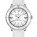 Класс водозащиты: 100 метров, позволит плавать, нырять и заниматься другими водными видами спорта. Корпус часов изготовлен из нержавеющей стали, серебристого цвета. Белый ремешок из телячьей кожи со складной клипсой из нержавеющей стали.