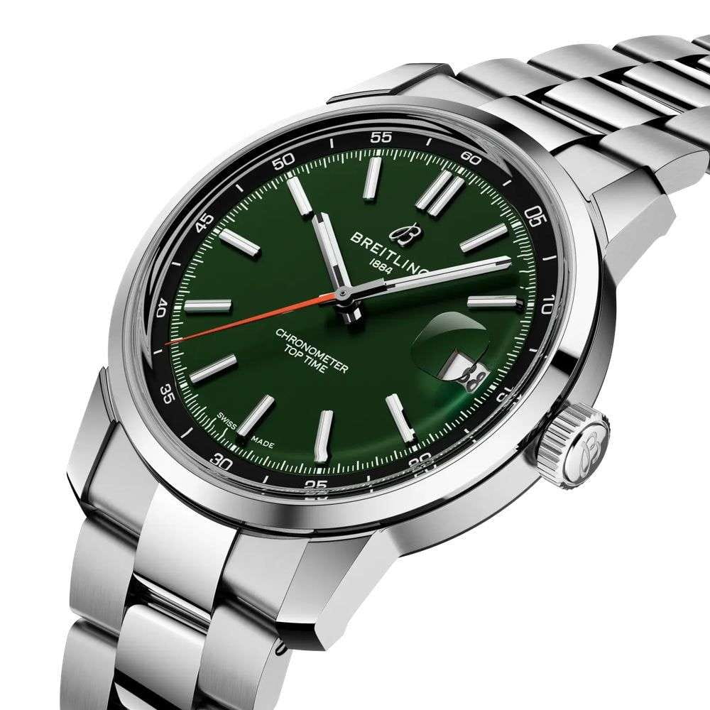 Breitling Top Time B31 AB3113171L1A1 — стильная новинка 2025 года с характерной винтажной эстетикой и современным механизмом собственного производства. Корпус диаметром 38 мм выполнен из нержавеющей стали с полированной отделкой. Прозрачная задняя крышка позволяет наблюдать за работой механизма. Циферблат защищён выпуклым сапфировым стекломСапфировое стеклоПрочный и надёжный материал из кристалла сапфира синтетического происхождения, характеризующийся особой твёрдостью и устойчивостью к царапинам и повреждениям. с двухсторонним антибликовым покрытиемАнтибликовое покрытиеСлой оксида металла в 0,13-0,3 микрон, благодаря которому стекло часов не бликует и не отражает свет. Антибликовое покрытие уменьшает отражение света в 10 раз, обеспечивая отличную читаемость показателей циферблата.. Зелёный циферблат с контрастным внутренним кольцом и яркой оранжевой секундной стрелкой оформлен в узнаваемом стиле коллекции Top Time. Стрелки и часовые метки имеют люминесцентное покрытиеЛюминесцентное покрытиеПозволяет считывать показания времени в темноте. Производители наносят на стрелки, часовые индексы, безель или поверхность циферблата светонакопительный состав, дающий холодное свечение., обеспечивающее отличную читаемость. Внутри установлен автоматический калибр Breitling B31, отображающий часы, минуты, малую секунду и дату. Механизм обеспечивает запас хода до 78 часов и работает с частотой 28 800 полуколебаний в час. Часы укомплектованы стальным браслетом на раскладной застёжкойРаскладная застёжкаТакой тип застёжки используется только на браслетах из металла. Она никогда не раскрывается полностью, происходит разделение на 2 и более частей. Раскладывающая застёжка снизит вероятность потери часов к минимуму.. Водонепроницаемость 100 метров делает модель универсальной для повседневного использования. Top Time B31 AB3113171L1A1 — гармония винтажного дизайна и инновационного часового мастерства.