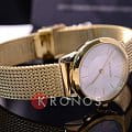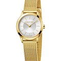Стильным элементом стал стальной браслет плетения Mesh. Привлекательно выглядит игра оттенков серебристого циферблата «солнечные лучи» и PVD-покрытияPVDУльтратонкое покрытие наносится в технике вакуумного напыления, сочетает в себе нитрид титана особой прочности со слоем золота или оксида хрома. Несёт в себе декоративную или защитную функцию. золотистого цвета. Швейцарский кварцевый калибр от ETA. Минеральное стекло. Водонепроницаемость до 3 бар.