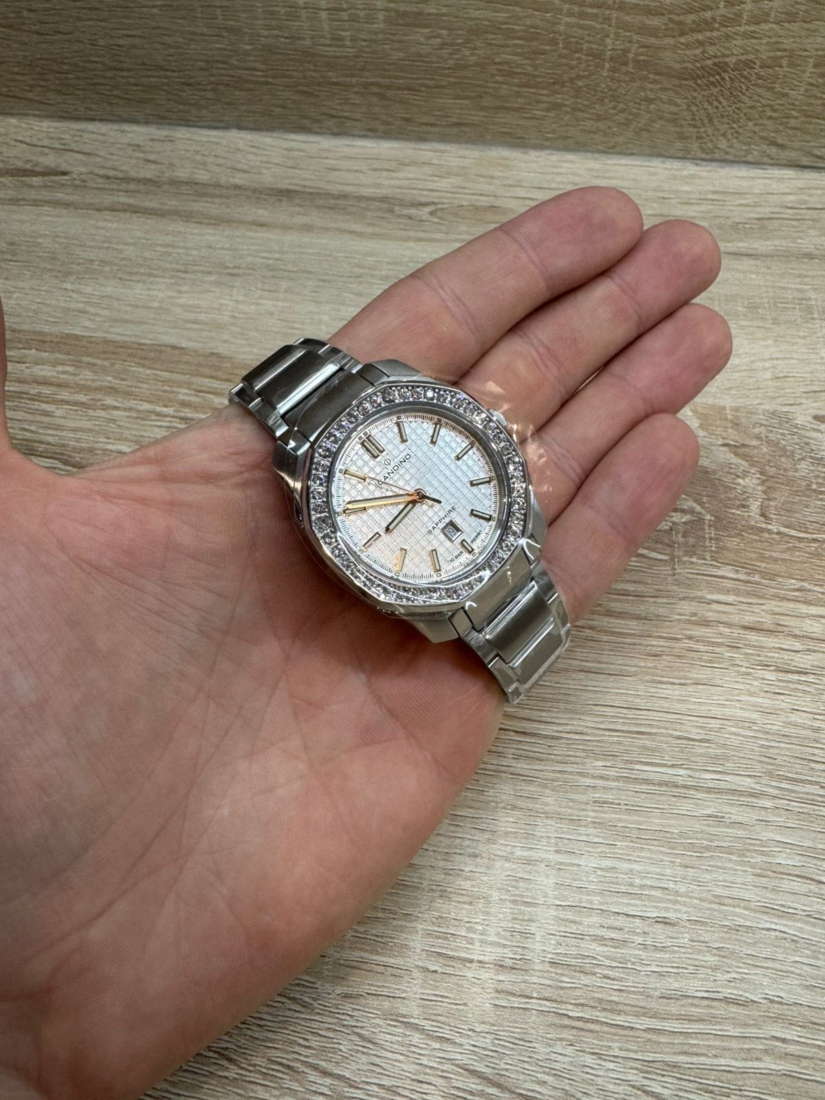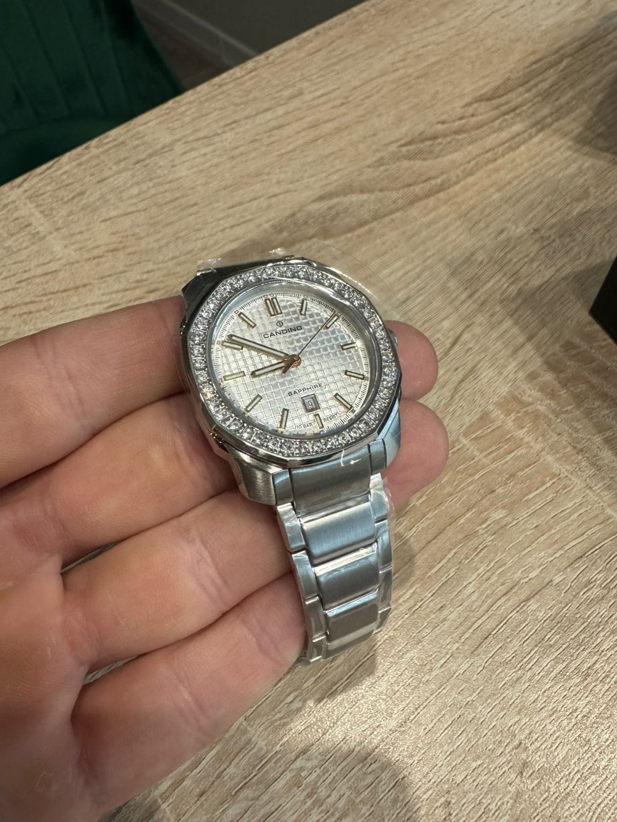 Женские наручные часы Candino Elegance C4756/1 с надёжным кварцевым механизмом. Корпус и браслет часов изготовлены из нержавеющей стали. Сапфировое стеклоСапфировое стеклоПрочный и надёжный материал из кристалла сапфира синтетического происхождения, характеризующийся особой твёрдостью и устойчивостью к царапинам и повреждениям. повышенной прозрачности, устойчивое к мелким механическим повреждениям. Стальной браслет на раскладной застёжкеРаскладная застёжкаТакой тип застёжки используется только на браслетах из металла. Она никогда не раскрывается полностью, происходит разделение на 2 и более частей. Раскладывающая застёжка снизит вероятность потери часов к минимуму.. Стрелки и метки с люминесцентным покрытиемЛюминесцентное покрытиеПозволяет считывать показания времени в темноте. Производители наносят на стрелки, часовые индексы, безель или поверхность циферблата светонакопительный состав, дающий холодное свечение.. БезельБезельВнешний ободок, закрепляющий стекло. В спортивных часах так называется поворотное кольцо с делениями на циферблате, выполняет роль таймера – замеряет отрезки времени на шкале. Неподвижный безель – элемент декора. Однонаправленно вращающийся безель на дайверских часах позволяет фиксировать моменты погружения и выныривания на поверхность. инкрустирован кристаллами. Класс водозащиты: 100 метров, позволит плавать, нырять и заниматься другими водными видами спорта. Окошко даты находится в положении 6 часов.