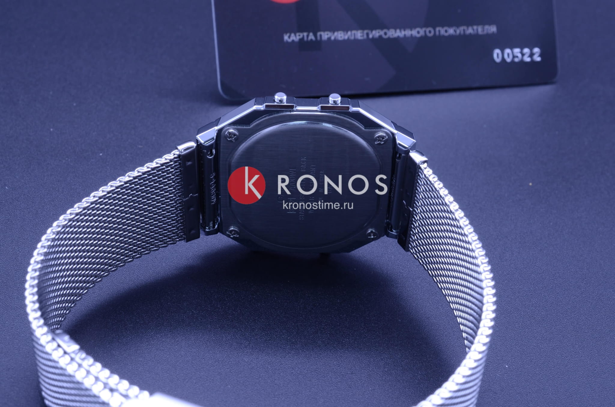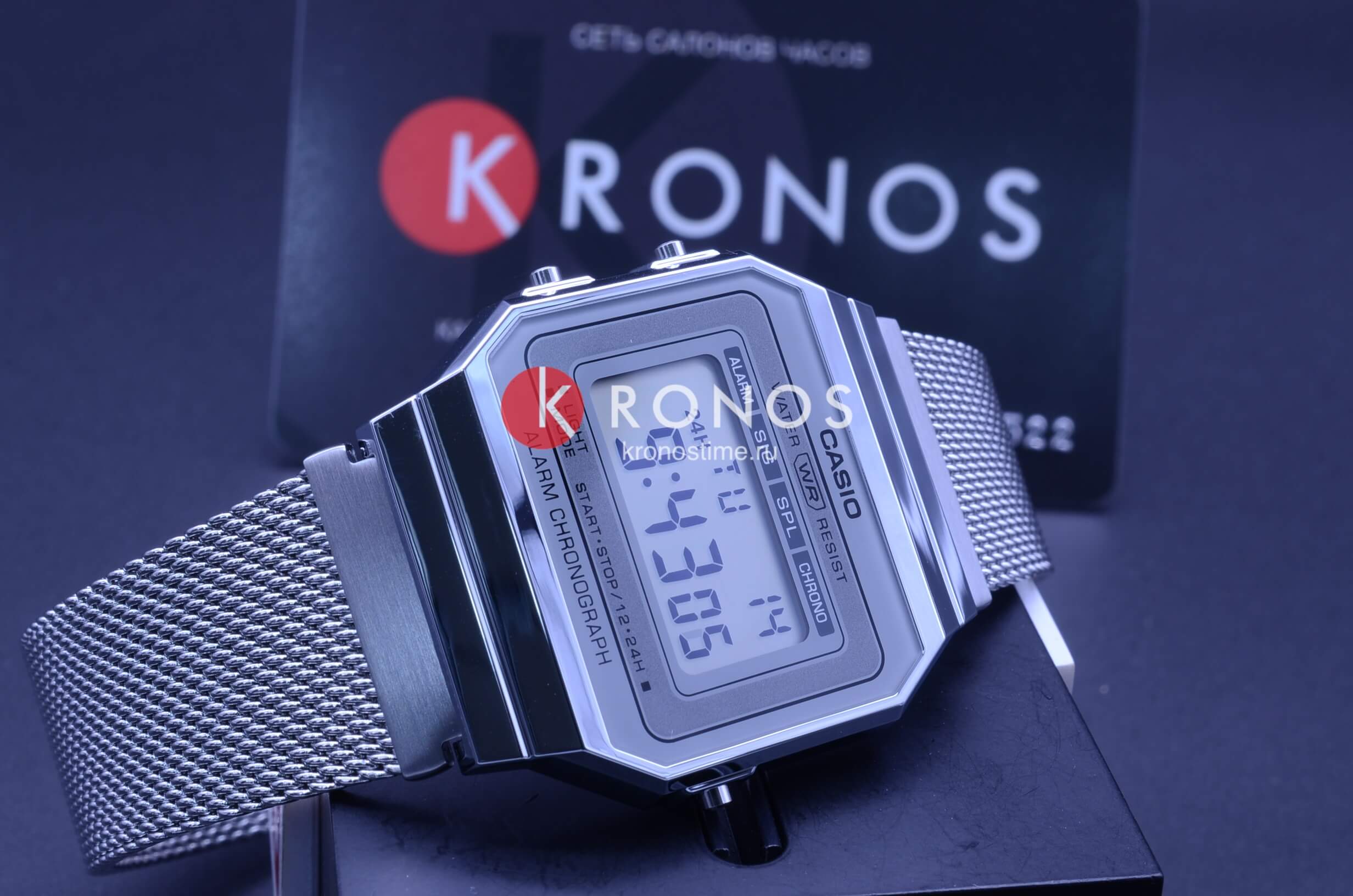 Серебристая цветовая гамма подойдёт к любой одежде, предоставляя простор для экспериментов. Цифровой дисплей оснащён функцией подсветки, облегчающей считывание информации в темноте. Среди дополнительных возможностей числятся будильник, календарь, секундомер. Ударопрочный корпус сделан из полимерного пластика. Стильный браслет миланского плетения. Минеральное стекло отличается устойчивостью к появлению царапин. Габариты: 38,6 x 36,3 x 9,6 мм.