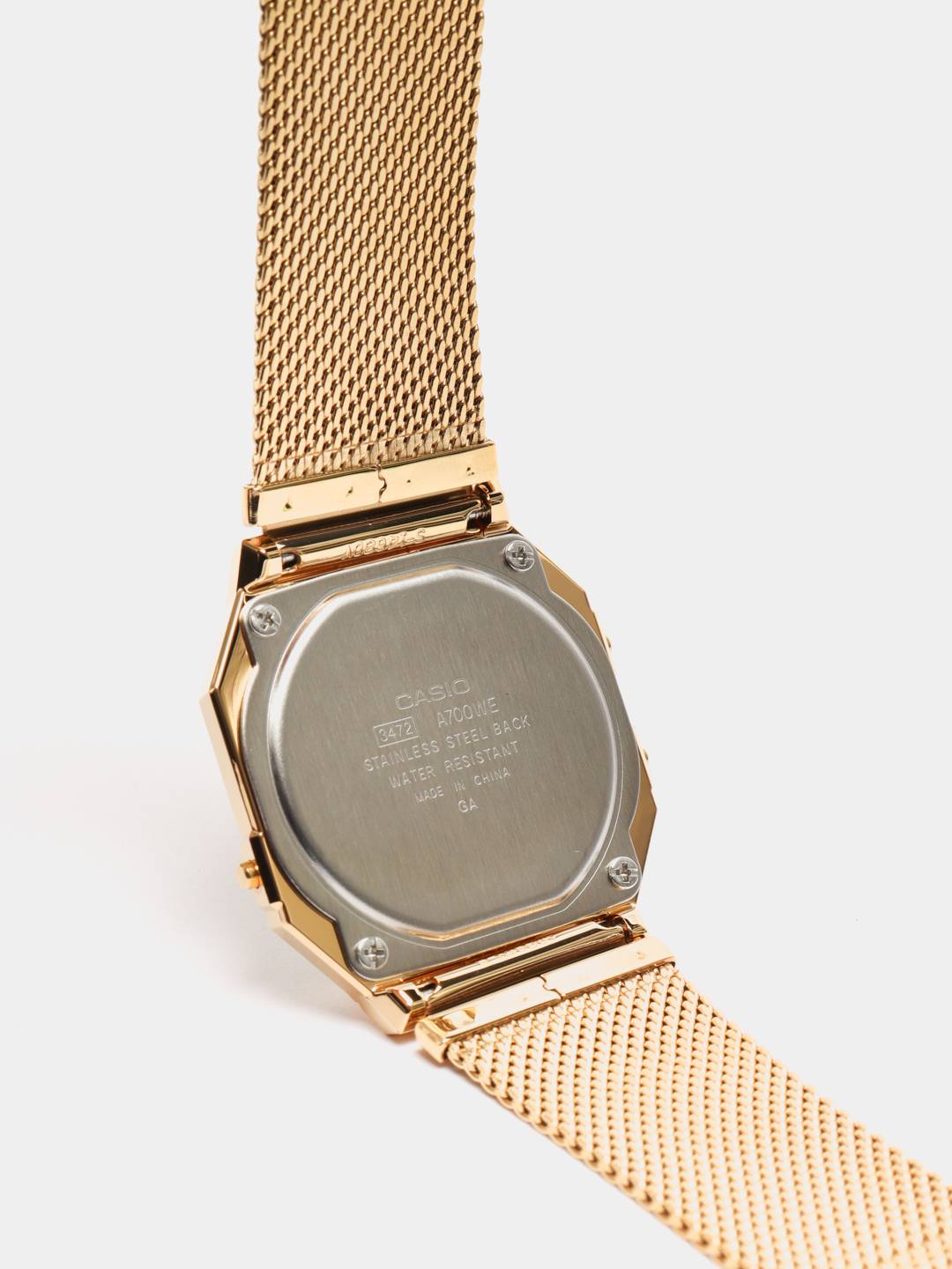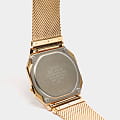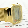 Золотистое исполнение сочетается с любой одеждой, это универсальный вариант на каждый день. Компактный корпус из полимерного пластика отлично смотрится на запястье. Модель обладает базовым функционалом: будильник, секундомер, автоматический календарь. Особый стиль придаёт браслет из нержавеющей стали 316L миланского плетения. Батарейка рассчитана на 3 года службы. Минеральное стекло препятствует образованию царапин. Габариты: 38,6 x 36,3 x 9,6 мм.