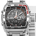Стильные  наручные кварцевые мужские часы. Циферблат черного цвета с контрастными элементами дизайна. Корпус часов выполнен из нержавеющей стали. Минеральное стекло устойчиво к появлению царапин. Часы надежно удерживаются на руке браслетом из высококачественной стали с антикоррозийными свойствами. Водонепроницаемость 100М. Часы оснащены секундомером, таймером, будильником, вечным календарем, вторым часовым поясом, термометром.