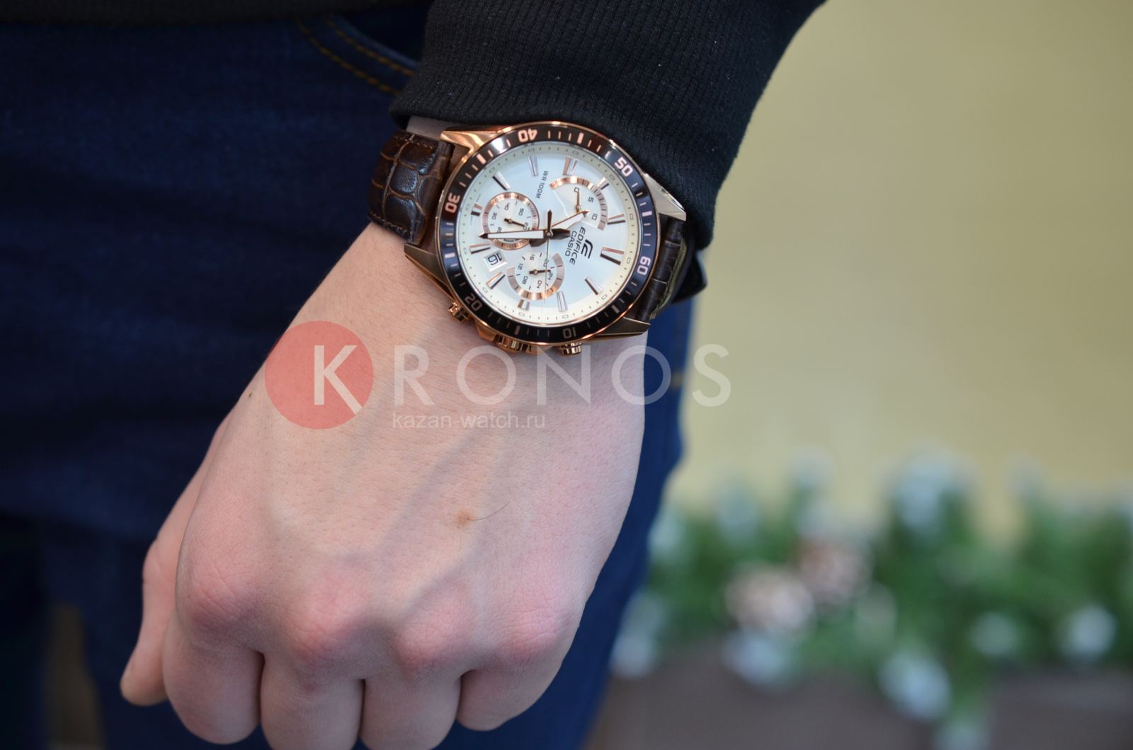 Оригинальный циферблат и чёрный безельБезельВнешний ободок, закрепляющий стекло. В спортивных часах так называется поворотное кольцо с делениями на циферблате, выполняет роль таймера – замеряет отрезки времени на шкале. Неподвижный безель – элемент декора. Однонаправленно вращающийся безель на дайверских часах позволяет фиксировать моменты погружения и выныривания на поверхность. превосходно сочетаются с золотистыми переливами ударопрочного корпусаУдаропрочный корпусМеханизм заключён в корпус, выполненный из современных материалов, устойчивых к ударам, механическим повреждениям и падению с высоты: инновационный пластик, карбон, нержавеющая сталь, титан. с защитным IP-покрытиемIP-покрытиеМетод ионного напыления. Демонстрирует повышенную устойчивость к истиранию, окислению и химическим веществам. Под воздействием высокого давления и температуры около 1500°C молекулы металла надёжно соединяются с частицами корпуса часов.. Приметный аксессуар отлично дополнит брендовый деловой костюм. Работу часов обеспечивает японский кварцевый калибр Miyota с точностью хода +/- 30 секунд в месяц. Батарейка характеризуется 3-летним сроком службы. Коричневый ремешок из натуральной кожи с тиснением под кожу крокодила. Люминесцентная подсветкаЛюминесцентное покрытиеПозволяет считывать показания времени в темноте. Производители наносят на стрелки, часовые индексы, безель или поверхность циферблата светонакопительный состав, дающий холодное свечение.. Закручивающаяся задняя крышка. Заводная головка с системой защиты. Закаленное минеральное стекло. Водонепроницаемость при давлении до 10 бар. ХронографХронографФункция позволяет измерять отрезки времени с особой точностью: часы, минуты, секунды. Верным признаком хронографа является наличие на циферблате 3 дополнительных окошек-счётчиков., секундомер, индикация числа. Габариты: 53 x 47 x 12,3 мм.