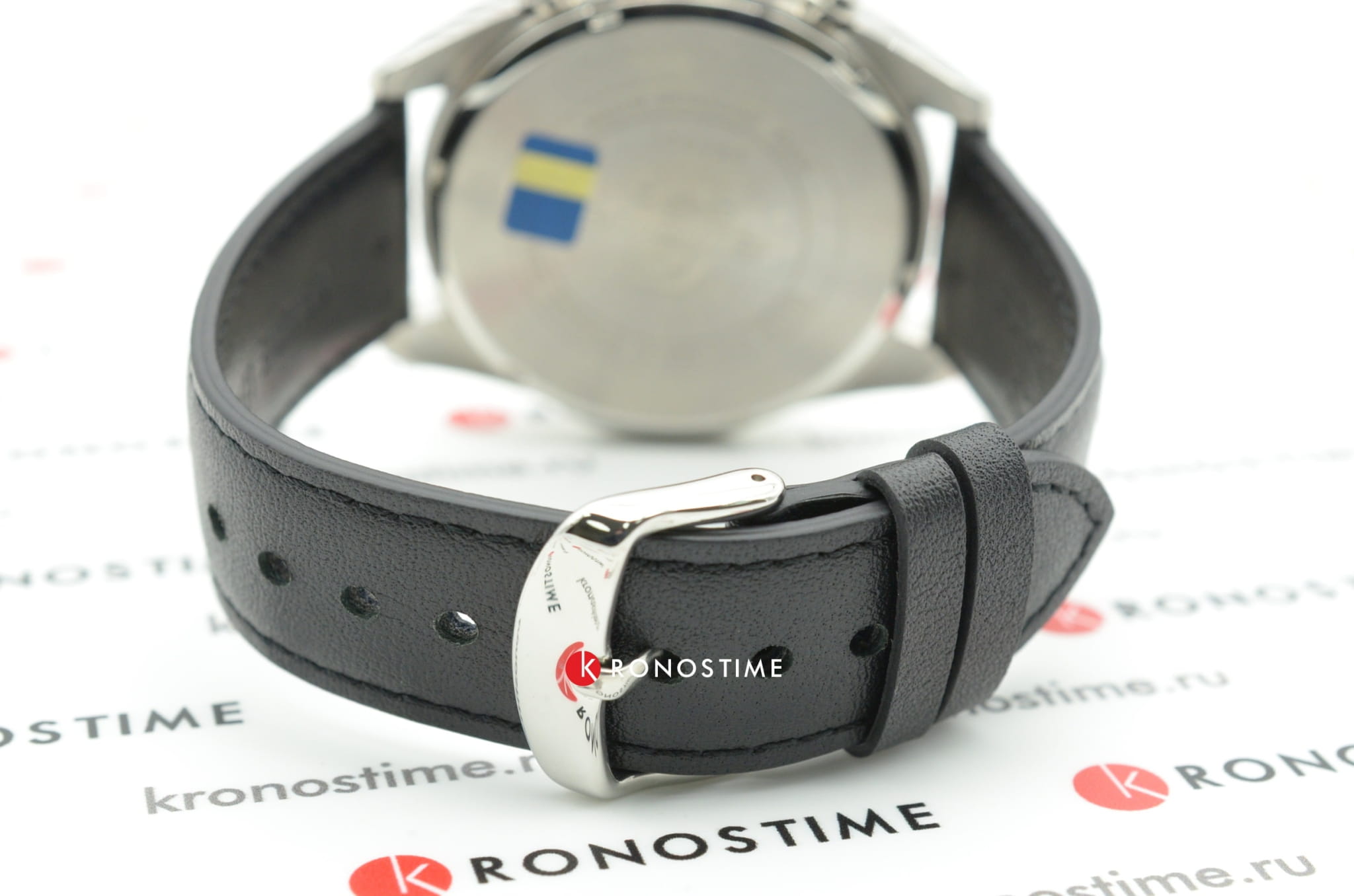 Спортивный аксессуар отличается динамичным циферблатом с большим количеством деталей, элементы голубых оттенков отлично выделяются на тёмном фоне. Ударопрочный корпусУдаропрочный корпусМеханизм заключён в корпус, выполненный из современных материалов, устойчивых к ударам, механическим повреждениям и падению с высоты: инновационный пластик, карбон, нержавеющая сталь, титан. выполнен из нержавеющей стали 316L, характеризующейся долговечностью. Точность хода кварцевого механизма составляет +/- 30 секунд в месяц. Люминесцентная подсветкаЛюминесцентное покрытиеПозволяет считывать показания времени в темноте. Производители наносят на стрелки, часовые индексы, безель или поверхность циферблата светонакопительный состав, дающий холодное свечение.. Минеральное стекло. Ремешок из натуральной кожи. Завинчивающаяся задняя крышка. Водостойкость 10 бар. ХронографХронографФункция позволяет измерять отрезки времени с особой точностью: часы, минуты, секунды. Верным признаком хронографа является наличие на циферблате 3 дополнительных окошек-счётчиков., секундомер, календарь. Габариты: 53,5 x 48,7 x 12,6 мм.