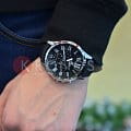 Кварцевый японский механизм Miyota. Точность хода не хуже -10 +15 сек./в месяц. Часы оснащены функцией хронографа, с точностью 1/10с и временем измерения 1ч. Циферблат черного цвета с контрастными элементами дизайна. Стрелки и индексы с светонакопительным нанесением. Корпус выполнен из нержавеющей стали. Ремешок из натуральной кожи черного цвета. Минеральное стекло устойчиво к появлению царапин. Водонепроницаемость 100М. В часах можно плавать. Степень водонепроницаемости не является величиной, эквивалентной функциональной рабочей глубине.