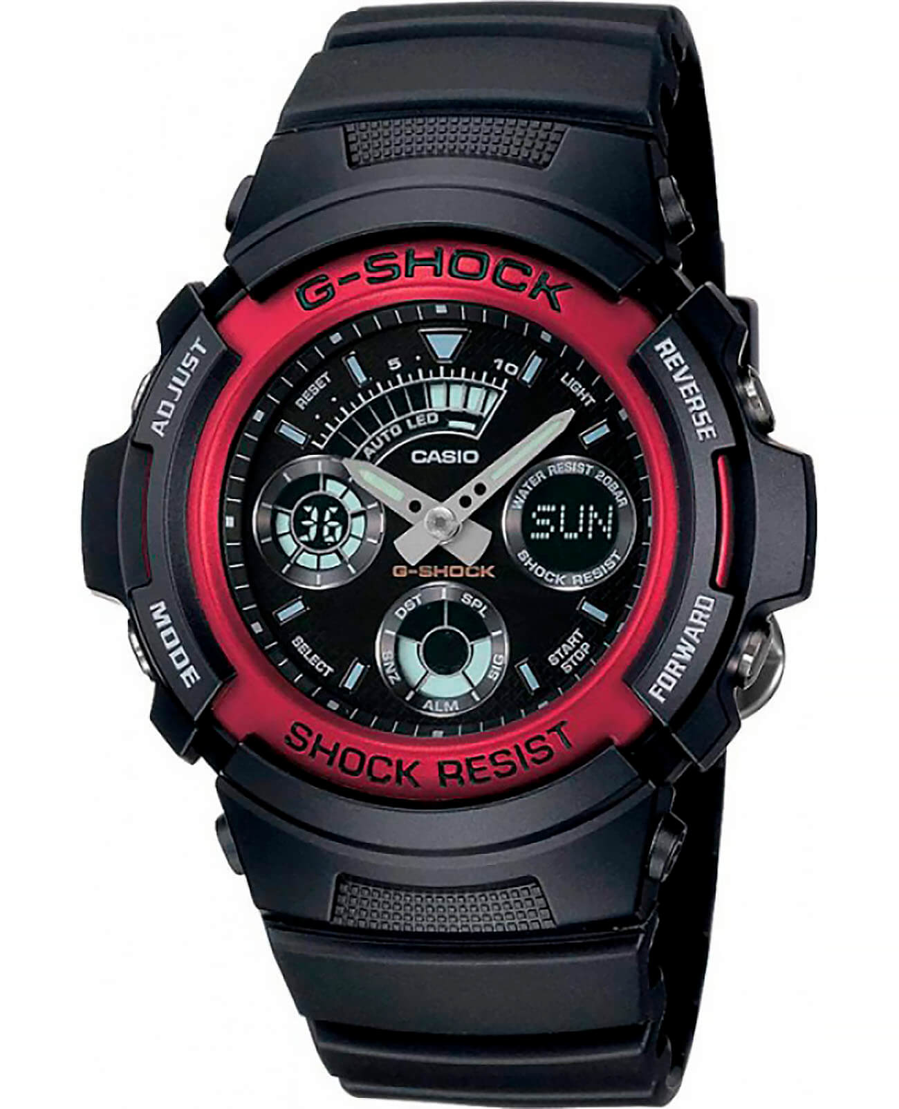 Компактный аксессуар имеет противоударный корпусУдаропрочный корпусМеханизм заключён в корпус, выполненный из современных материалов, устойчивых к ударам, механическим повреждениям и падению с высоты: инновационный пластик, карбон, нержавеющая сталь, титан. из полимерного материала, способного выдерживать падения с высоты и повреждения. Привлекательно смотрится красный безельБезельВнешний ободок, закрепляющий стекло. В спортивных часах так называется поворотное кольцо с делениями на циферблате, выполняет роль таймера – замеряет отрезки времени на шкале. Неподвижный безель – элемент декора. Однонаправленно вращающийся безель на дайверских часах позволяет фиксировать моменты погружения и выныривания на поверхность. из нержавеющей стали 316L с IP-покрытиемIP-покрытиеМетод ионного напыления. Демонстрирует повышенную устойчивость к истиранию, окислению и химическим веществам. Под воздействием высокого давления и температуры около 1500°C молекулы металла надёжно соединяются с частицами корпуса часов.. Аналого-цифровые часы работают от батарейки, рассчитанной на 3 года безупречной эксплуатации. Минеральное стекло. Автоматическая светодиодная подсветкаСветодиодная подсветкаСветодиодная или LED-подсветка обеспечивает появление яркого холодного свечения за счёт LED-элементов - маленьких лампочек. Они потребляют минимальное количество энергии, чаще всего можно встретить 1 светодиод, в нижней части циферблата. дисплея, стрелки и метки с люминесцентным покрытиемЛюминесцентное покрытиеПозволяет считывать показания времени в темноте. Производители наносят на стрелки, часовые индексы, безель или поверхность циферблата светонакопительный состав, дающий холодное свечение.. 12/24-часовое отображение времени. Надёжный полимерный ремешок. Водонепроницаемость 200 метров. Дополнительные возможности: таймер, будильник, мировое времяМировое время Полезное часовое усложнение, отображающее время в основных городах и известных областях по всему миру, оно связано с часовыми поясами, удобно для путешественников и бизнесменов. , секундомер, автоматический календарь. Габариты: 46,4 x 52 x 14,9 мм.