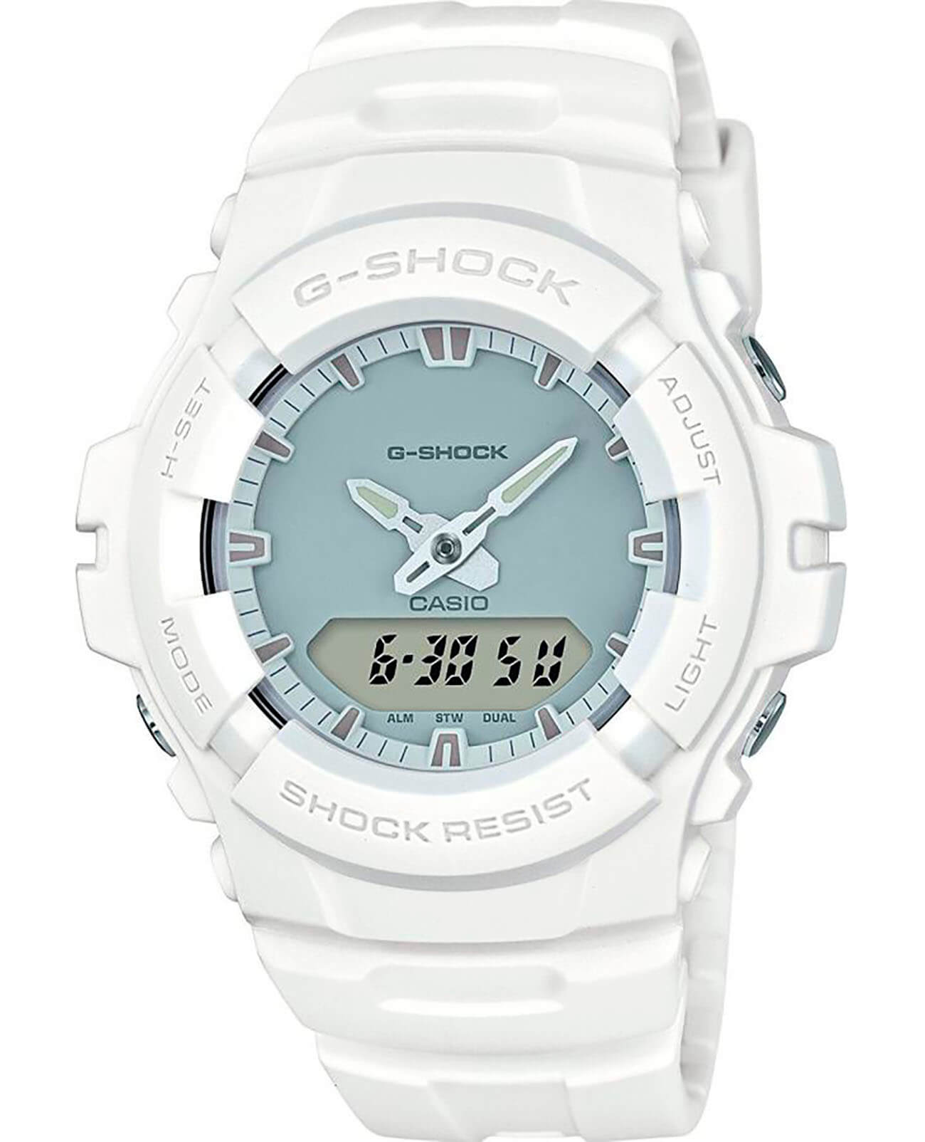 Аналого-цифровая модель в белом цвете имеет минималистичное оформление, относящееся к направлению уличной моды. Наручные часы оснащены высокоточным кварцевым механизмом, заключённым внутри ударопрочного корпусаУдаропрочный корпусМеханизм заключён в корпус, выполненный из современных материалов, устойчивых к ударам, механическим повреждениям и падению с высоты: инновационный пластик, карбон, нержавеющая сталь, титан. из полимерного пластика. Идентичный материал был выбран и для удобного и мягкого ремешка. Батарейка рассчитана на 3 года эксплуатации. Закаленное минеральное стекло. Электролюминесцентная подсветкаЭлектролюминесцентная подсветкаЭлектролюминесцентная панель устанавливается под ЖК-экраном часов, при нажатии кнопки электричество преобразуется в свет за счёт подачи напряжения на атомы фосфора, такой тип подсветки позволяет освещать весь циферблат. для освещения циферблата. 12/24-х часовое отображение времени. Защита от влияния магнитного поля. ХронографХронографФункция позволяет измерять отрезки времени с особой точностью: часы, минуты, секунды. Верным признаком хронографа является наличие на циферблате 3 дополнительных окошек-счётчиков., второй часовой пояс, автоматический календарь до 2099 года, будильник. Габариты: 49,6 x 47,8 x 15,7 мм.