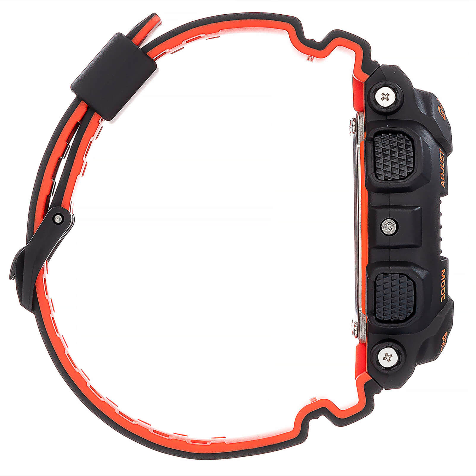 Аналого-цифровая модель с оранжевыми цветовыми акцентами обладает внушительным противоударным корпусомУдаропрочный корпусМеханизм заключён в корпус, выполненный из современных материалов, устойчивых к ударам, механическим повреждениям и падению с высоты: инновационный пластик, карбон, нержавеющая сталь, титан. с рифлеными кнопками. Привлекательно выглядят крупные детали, и стрелки с перфорацией. Аксессуар "Three-eye" с 3 счётчиками в верхней части циферблата оснащается высокоточным японским кварцевым механизмом. Батарейка рассчитана на 2 года. 12-ти и 24-х часовой формат отображения времени. Светодиодная подсветкаСветодиодная подсветкаСветодиодная или LED-подсветка обеспечивает появление яркого холодного свечения за счёт LED-элементов - маленьких лампочек. Они потребляют минимальное количество энергии, чаще всего можно встретить 1 светодиод, в нижней части циферблата. циферблата. Устойчивость к магнитным полям. Минеральное стекло. Функции: секундомер, расчёт скорости по указанной дистанции, таймер с автоповтором, , мировое времяМировое время Полезное часовое усложнение, отображающее время в основных городах и известных областях по всему миру, оно связано с часовыми поясами, удобно для путешественников и бизнесменов. , будильник, календарь до 2099 года, хронографХронографФункция позволяет измерять отрезки времени с особой точностью: часы, минуты, секунды. Верным признаком хронографа является наличие на циферблате 3 дополнительных окошек-счётчиков.. Габариты: 55 x 51,2 x 16,9 мм.