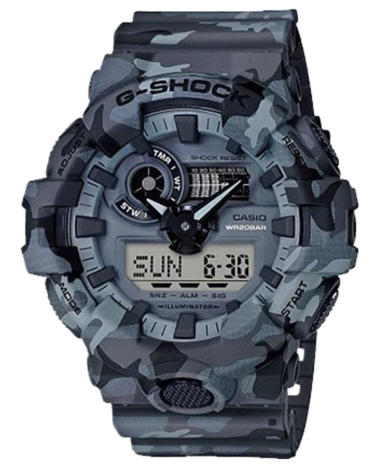 Перед вами модель из серии G-SHOCK GA-700 в стильном и брутальном серо-камуфляжном корпусе! Благодаря новому переосмысленному дизайну и крупным стрелкам, часы имеют не только великолепный внешний вид, но и обладают действительно удобной индикацией времени.