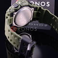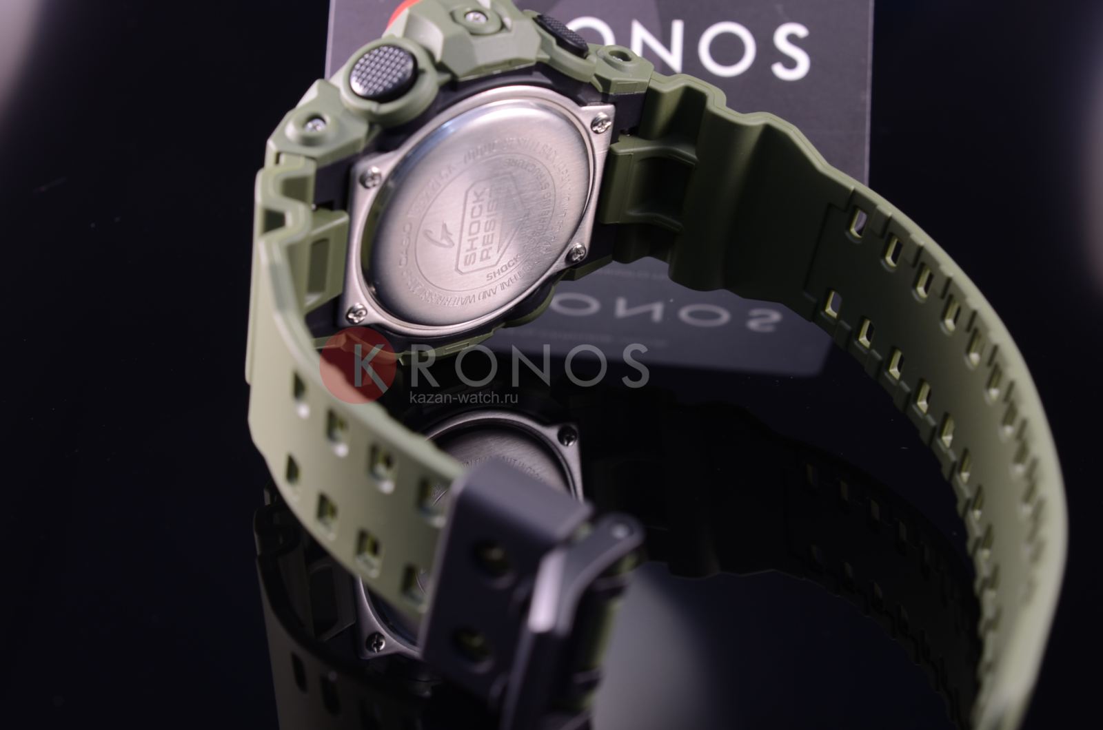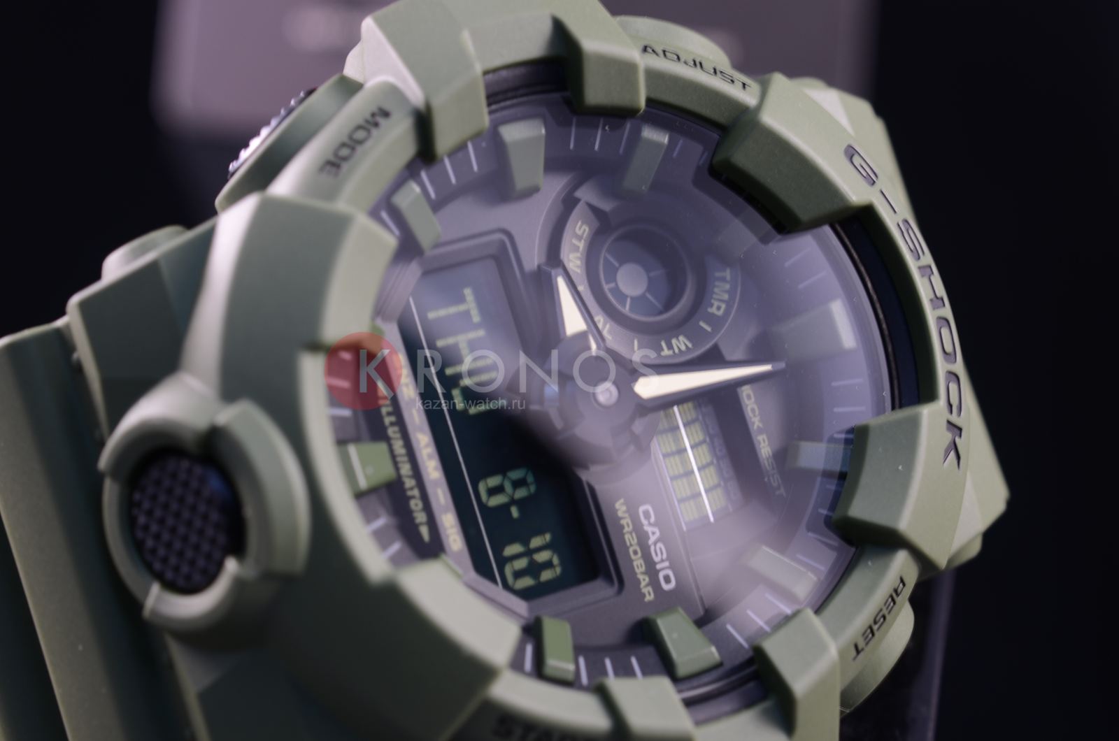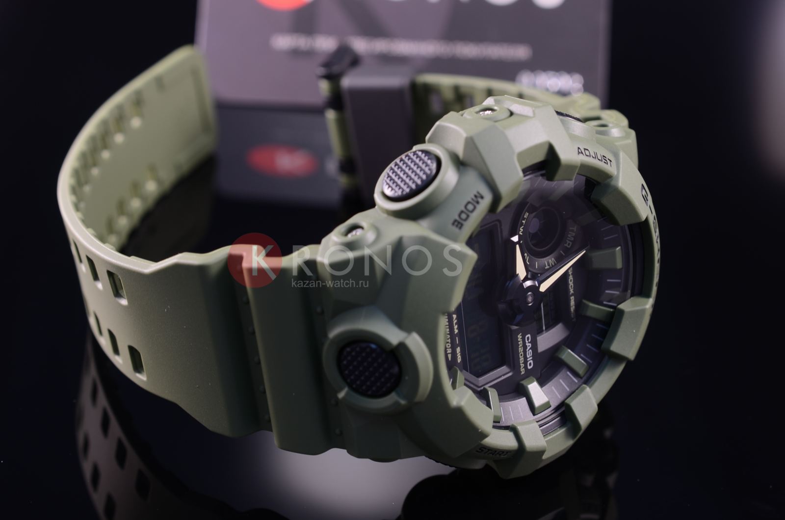 Аналого-цифровая модель в тёмно-зелёном исполнении идеально подойдёт для ношения в любой ситуации, гармонично смотрится контрастный циферблат с крупными элементами дизайна. Часы в стиле милитари из серии GA-700 обладают противоударным корпусомУдаропрочный корпусМеханизм заключён в корпус, выполненный из современных материалов, устойчивых к ударам, механическим повреждениям и падению с высоты: инновационный пластик, карбон, нержавеющая сталь, титан. из полимерного пластика, стойко переносящим любые механические повреждения. Батарейка рассчитана на 5 лет службы. Водонепроницаемость до 20 бар. Минеральное стекло устойчиво к появлению царапин. ЛюминесцентнаяЛюминесцентное покрытиеПозволяет считывать показания времени в темноте. Производители наносят на стрелки, часовые индексы, безель или поверхность циферблата светонакопительный состав, дающий холодное свечение. и светодиодная подсветкаСветодиодная подсветкаСветодиодная или LED-подсветка обеспечивает появление яркого холодного свечения за счёт LED-элементов - маленьких лампочек. Они потребляют минимальное количество энергии, чаще всего можно встретить 1 светодиод, в нижней части циферблата.. Дополнительные возможности: функция перемещения стрелок, включение и выключение звука кнопок, секундомер, мировое времяМировое время Полезное часовое усложнение, отображающее время в основных городах и известных областях по всему миру, оно связано с часовыми поясами, удобно для путешественников и бизнесменов. , таймер с автоповтором, UTCUTCВсемирное кординационное время, не имеющее привязки к географическому положению Гринвича, основывается на атомном отсчёте времени. Регулировка времени осуществляется более точно, чем устаревшее GMT.