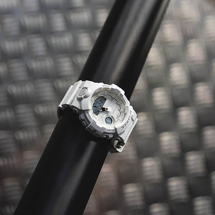 Белоснежные наручные часы с противоударным корпусомУдаропрочный корпусМеханизм заключён в корпус, выполненный из современных материалов, устойчивых к ударам, механическим повреждениям и падению с высоты: инновационный пластик, карбон, нержавеющая сталь, титан. сделаны из полимерного пластика, который устойчив к повреждениям и падению с высоты. Такой же материал был выбран и для гибкого ремешка, обеспечивающего комфортное ношение. Это первая модель из линейки G-Shock, оснащённая шагомером, теперь вы сможете в любое время следить за своей активностью. Японский кварцевый механизм работает от батарейки, срок её службы - 2 года. Минеральное стекло. Светодиодная подсветкаСветодиодная подсветкаСветодиодная или LED-подсветка обеспечивает появление яркого холодного свечения за счёт LED-элементов - маленьких лампочек. Они потребляют минимальное количество энергии, чаще всего можно встретить 1 светодиод, в нижней части циферблата. циферблата, люминесцентное покрытиеЛюминесцентное покрытиеПозволяет считывать показания времени в темноте. Производители наносят на стрелки, часовые индексы, безель или поверхность циферблата светонакопительный состав, дающий холодное свечение. стрелок. Bluetooth-синхронизацияBluetoothСовременная технология, позволяющая синхронизировать часы с телефоном и переносить данные. Часы с Bluetooth расширяют возможности вашего смартфона и делают его использование ещё более удобным., таймер с автоповтором, секундомер, автоматический календарь, будильник. Водостойкость при давлении 20 бар. Габариты: 54,1 x 48,6 x 15,5 мм.