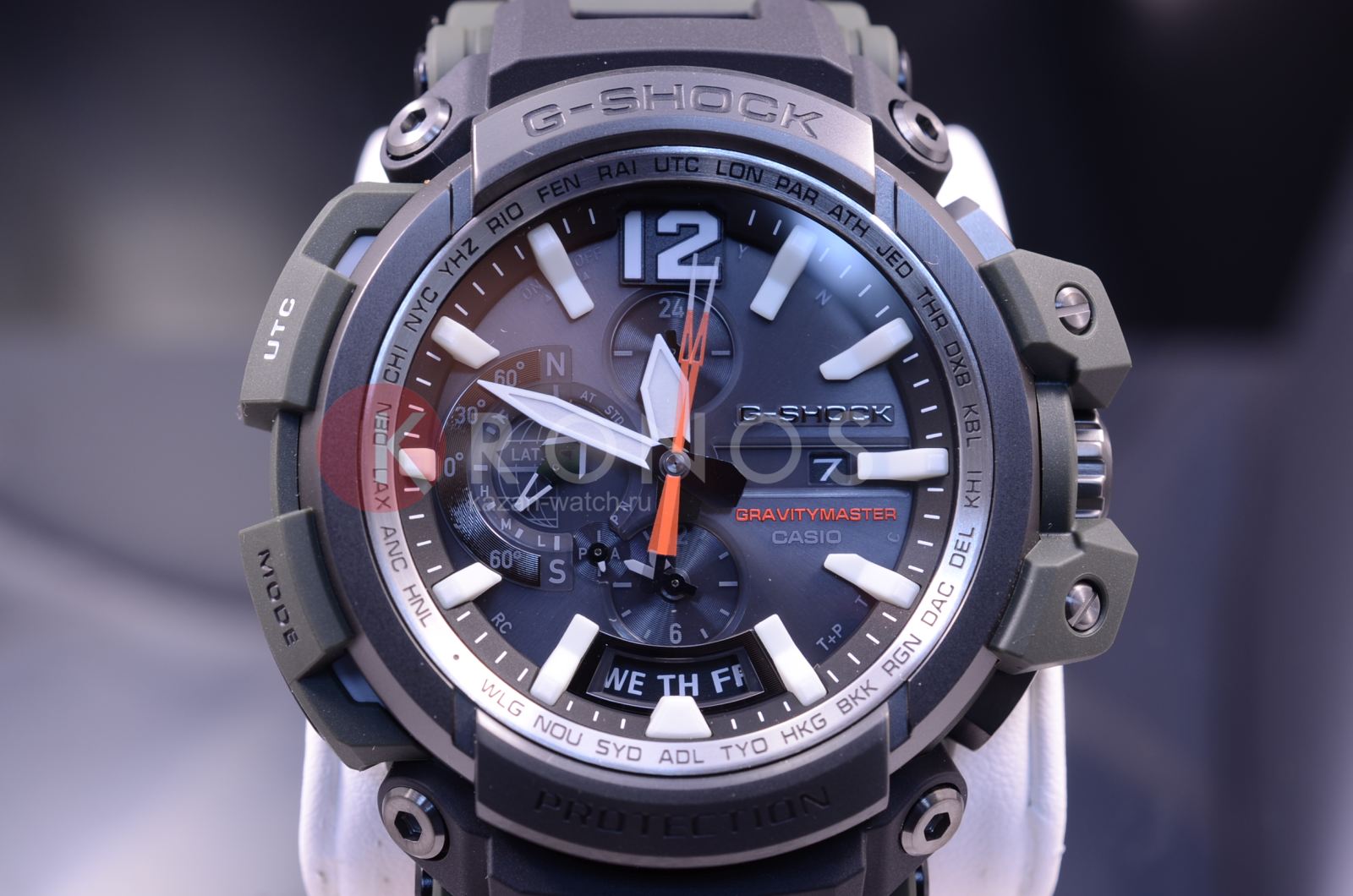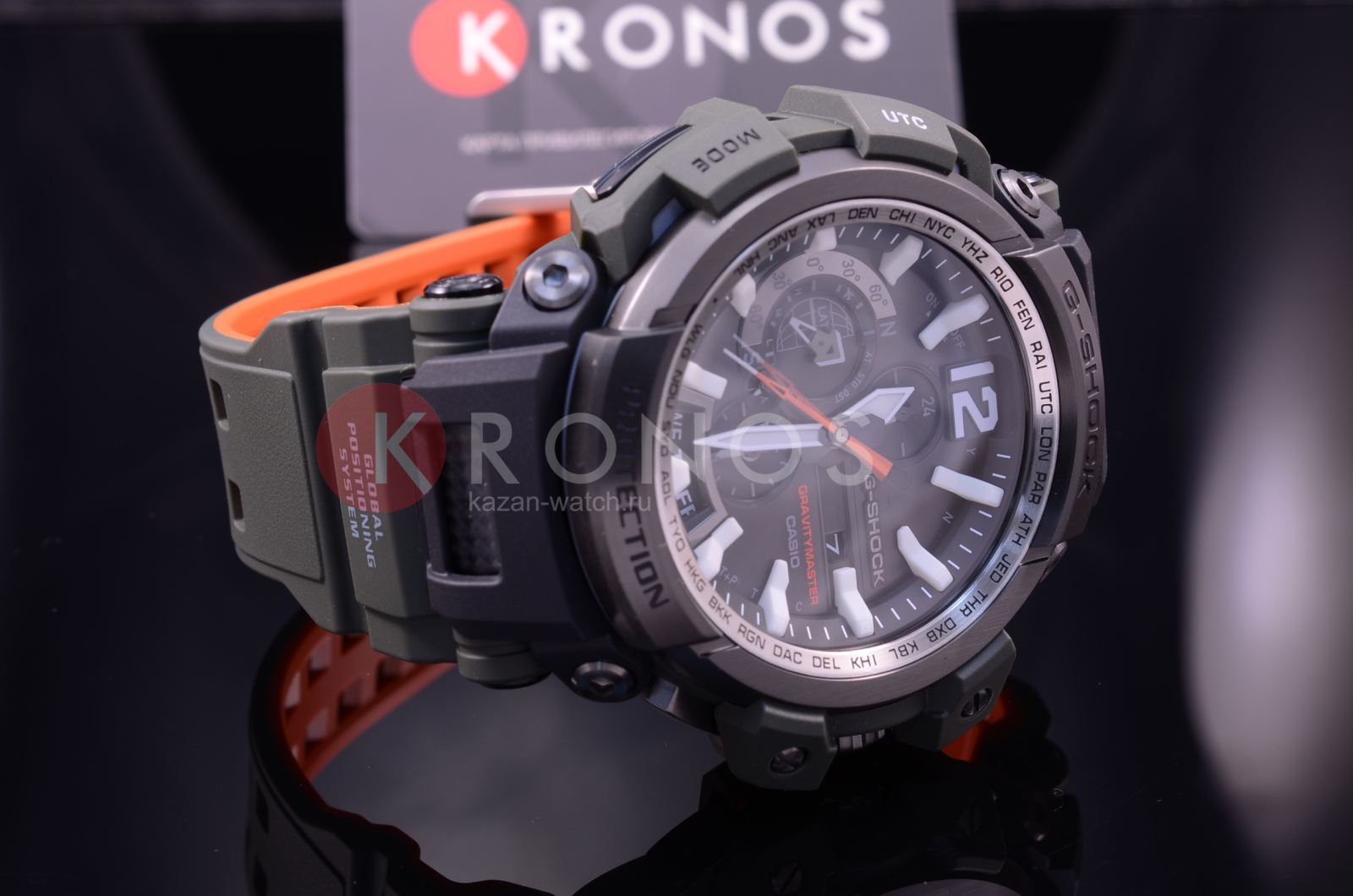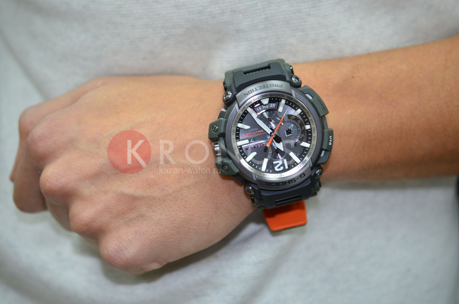 Флагманские G-SHOCK GPW-2000 в корпусе цвета хаки с темно-серым стальным безелем и ярко-оранжевой внутренней поверхностью ремешка. У данной модели 3 независимых вида синхронизации времени: GPS- и радио-синхронизация времени с атомными часами в разных частях света, а также синхронизация по Bluetooth с приложением G-Shock Connected на вашем смартфоне.