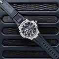 Отличительной особенностью стал противоударный корпусУдаропрочный корпусМеханизм заключён в корпус, выполненный из современных материалов, устойчивых к ударам, механическим повреждениям и падению с высоты: инновационный пластик, карбон, нержавеющая сталь, титан., выполненный из нержавеющей стали 316L и полимерного материала. Такая конструкция увеличивает устойчивость модели к падению и повреждениям. Тёмный циферблат с крупной индикацией времени отлично сочетается с металлическим блеском стали. Высокая точность хода обеспечивается кварцевым японским механизмом. Питание от солнечной батареи . Два вида подсветки - люминесцентнаяЛюминесцентное покрытиеПозволяет считывать показания времени в темноте. Производители наносят на стрелки, часовые индексы, безель или поверхность циферблата светонакопительный состав, дающий холодное свечение. и светодиоднаяСветодиодная подсветкаСветодиодная или LED-подсветка обеспечивает появление яркого холодного свечения за счёт LED-элементов - маленьких лампочек. Они потребляют минимальное количество энергии, чаще всего можно встретить 1 светодиод, в нижней части циферблата.. Надёжное минеральное стекло. Ремешок из полиуретана. Синхронизация со смартфоном BluetoothBluetoothСовременная технология, позволяющая синхронизировать часы с телефоном и переносить данные. Часы с Bluetooth расширяют возможности вашего смартфона и делают его использование ещё более удобным.. Автоматический календарь, хронографХронографФункция позволяет измерять отрезки времени с особой точностью: часы, минуты, секунды. Верным признаком хронографа является наличие на циферблате 3 дополнительных окошек-счётчиков., будильник, таймер, мировое времяМировое время Полезное часовое усложнение, отображающее время в основных городах и известных областях по всему миру, оно связано с часовыми поясами, удобно для путешественников и бизнесменов. . Водостойкость 20 бар. Габариты: 58,1 x 53,8 x 14,1 мм.