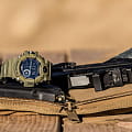 Модель серии Rangeman отличается защитной расцветкой хаки с жёлтыми деталями, брендовый аксессуар с массивными элементами оформления точно станет запоминающейся деталью образа. Наручные часы оснащены различными функциями, которые по достоинству оценят любители путешествовать: отображение восхода и заката солнца, термометр -10°C /+60°C, барометр, высотомер, таймер, мировое времяМировое время Полезное часовое усложнение, отображающее время в основных городах и известных областях по всему миру, оно связано с часовыми поясами, удобно для путешественников и бизнесменов. , 5 будильников, секундомер, цифровой компас. Японский кварцевый механизм. Технология . Индикатор уровня заряда аккумулятора. Ударопрочный корпусУдаропрочный корпусМеханизм заключён в корпус, выполненный из современных материалов, устойчивых к ударам, механическим повреждениям и падению с высоты: инновационный пластик, карбон, нержавеющая сталь, титан. из пластика. Минеральное стекло. Водозащита 20 бар. Автоматическая светодиодная подсветкаСветодиодная подсветкаСветодиодная или LED-подсветка обеспечивает появление яркого холодного свечения за счёт LED-элементов - маленьких лампочек. Они потребляют минимальное количество энергии, чаще всего можно встретить 1 светодиод, в нижней части циферблата.. Габариты: 55,2 x 53,5 x 18,2 мм.