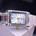 Необычный дизайн наручных часов сочетает в себе серебристый и золотые цвета. Прямоугольный корпус часов сделан из гипоаллергенной латуни. Двухцветный, широкий браслет выполнен из нержавеющей стали. Поверхность браслета плавно отражает падающий цвет. Временные отметки на циферблате сочетают в себе штрихи и арабские цифры. Аксессуар имеет небольшой вес и не приносит дискомфорта своему обладателю. Водонепроницаемость часов равна WR 30.
