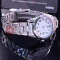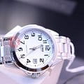 Преимуществами данной модели являются ее сдержанный дизайн и практичность. В качестве полезной функции на циферблате помимо времени показывается и текущая дата. Гладкий и гибкий серебристый браслет сделан из нержавеющей стали. Временны отметки представляют собой арабские цифры, которые расположены на круглом, белом циферблате. Часы оснащены неоновой подсветкой, которая приходит в действие после непродолжительной выдержи на свету. Вес аксессуара составляет 56 грамм.