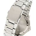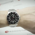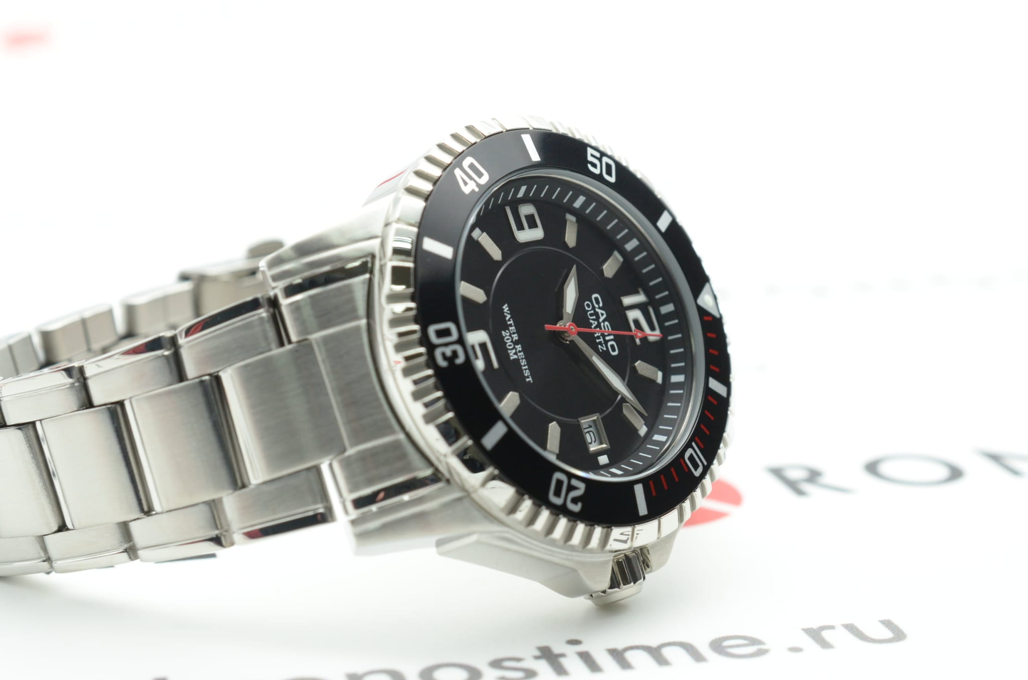 Чёрный циферблат имеет крупную индикацию времени, что позволяет увидеть показания даже при мимолётном взгляде на циферблат. Оформление выдержано в дайверской тематике, обратите внимание на однонаправленно вращающийся безельБезельВнешний ободок, закрепляющий стекло. В спортивных часах так называется поворотное кольцо с делениями на циферблате, выполняет роль таймера – замеряет отрезки времени на шкале. Неподвижный безель – элемент декора. Однонаправленно вращающийся безель на дайверских часах позволяет фиксировать моменты погружения и выныривания на поверхность. и высокую степень водозащиты WR 200. Кварцевый японский механизм. Срок службы батарейки составляет 10 лет. Надёжное минеральное стекло. Стрелки и метки с люминесцентным покрытиемЛюминесцентное покрытиеПозволяет считывать показания времени в темноте. Производители наносят на стрелки, часовые индексы, безель или поверхность циферблата светонакопительный состав, дающий холодное свечение.. Корпус и браслет из износоустойчивой хирургической стали 316L. Апертура даты. Габариты: 48 x 42,6 x 11,5 мм.