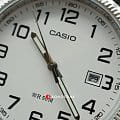 Элегантные часы от Casio выдержаны в повседневном стиле. Круглый, аккуратный корпус сделан из гипоаллергенной латуни. Мягкий браслет из натуральной кожи будет смотреться на запястье дорого и со вкусом. На белом циферблате расположены отчетливые арабские цифры и миниатюрный календарь. Минеральное стекло защищает изделие от царапин. Фактурный безельБезельВнешний ободок, закрепляющий стекло. В спортивных часах так называется поворотное кольцо с делениями на циферблате, выполняет роль таймера – замеряет отрезки времени на шкале. Неподвижный безель – элемент декора. Однонаправленно вращающийся безель на дайверских часах позволяет фиксировать моменты погружения и выныривания на поверхность. добавляет в аксессуар привлекательности. Подсветка NeobriteПодсветка NeobriteИспользование светонакопительных составов на основе сульфида цинка или алюмината стронция, яркий свет можно наблюдать на протяжении 6-10 часов после «зарядки» часов около источника света. позволяет с комфортом определять время в темное время суток. Кварцевый тип механизма. Батарейка служит 3 года. Водонепроницаемость составляет 5 Бар.