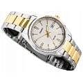 Лаконичный светлый циферблат с золотистыми стрелками и метками никогда не утратит актуальности. Элегантности добавляет фактурный безельБезельВнешний ободок, закрепляющий стекло. В спортивных часах так называется поворотное кольцо с делениями на циферблате, выполняет роль таймера – замеряет отрезки времени на шкале. Неподвижный безель – элемент декора. Однонаправленно вращающийся безель на дайверских часах позволяет фиксировать моменты погружения и выныривания на поверхность.. Браслет сделан из нержавеющей стали 316L, отличающейся устойчивостью к царапинам и износу, нанесено частичное IP-покрытиеIP-покрытиеМетод ионного напыления. Демонстрирует повышенную устойчивость к истиранию, окислению и химическим веществам. Под воздействием высокого давления и температуры около 1500°C молекулы металла надёжно соединяются с частицами корпуса часов.. Для корпуса была выбрана гипоаллергенная латунь. Кварцевый механизм с высокой точностью хода. Водостойкость 50 метров. Стрелки с люминесцентным покрытиемЛюминесцентное покрытиеПозволяет считывать показания времени в темноте. Производители наносят на стрелки, часовые индексы, безель или поверхность циферблата светонакопительный состав, дающий холодное свечение.. Минеральное стекло. Апертура даты. Габариты: 44,2 x 38,5 x 9,2 мм.