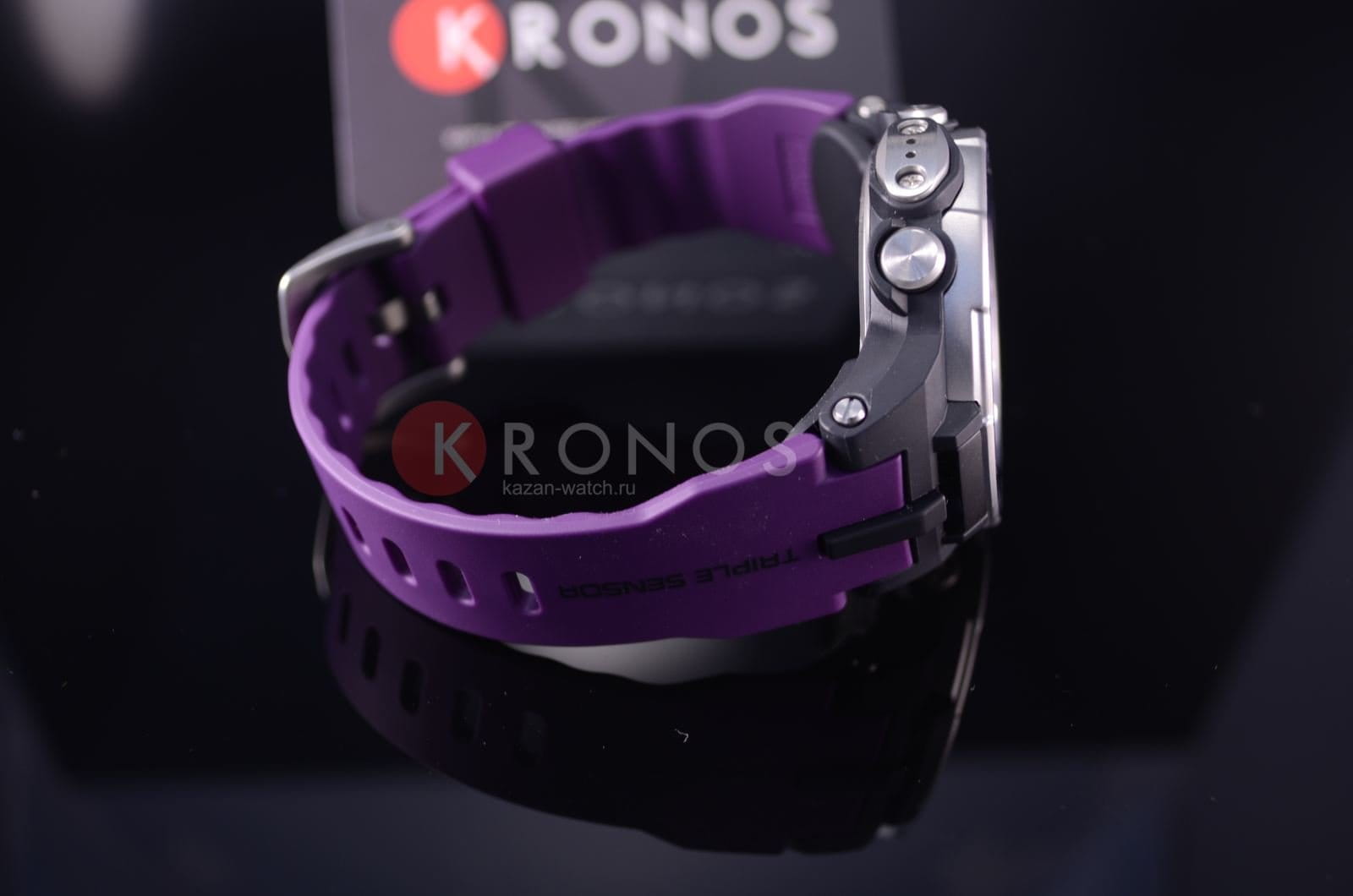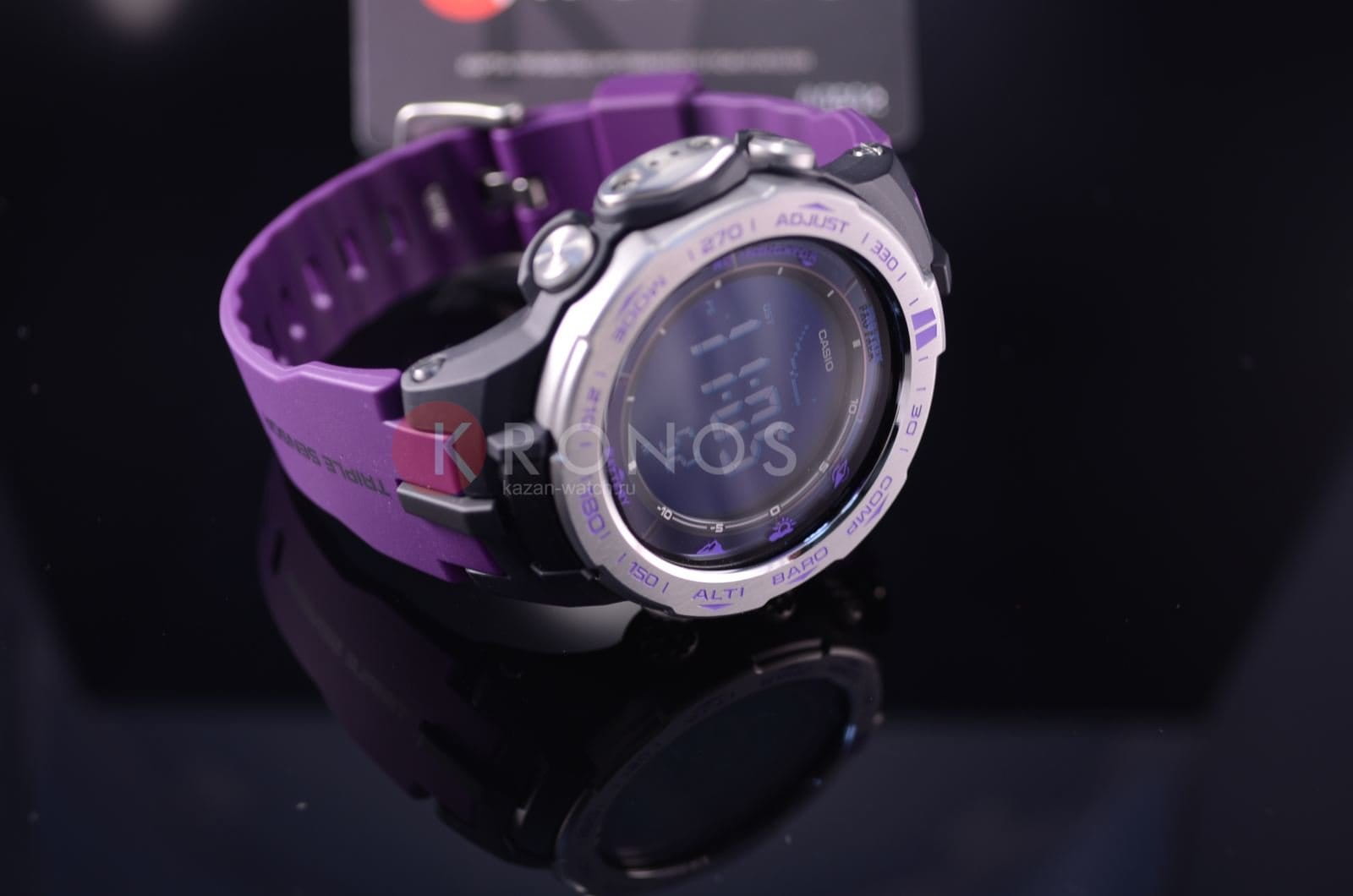 Casio PRW-3100-6E — современные мужские противоударные кварцевые часы круглой формы с черным цифровым циферблатом. Корпус из нержавеющей стали с минеральным стеклом удерживается на руке ярким, фиолетового цвета полиуретановым браслетом. Часы Casio PRW-3100-6E оснащены секундомером, таймером обратного отсчета, высотомером, барометром, термометром и компасом. Степень водонепроницаемости до 100 метров. Источник энергии - солнечная батарея.