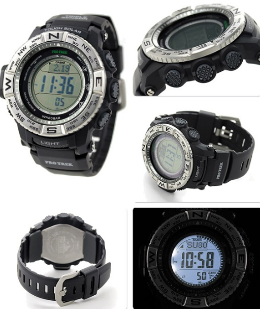 Часы, созданные для любителей активного отдыха. Питание от солнечной энергии Tough Solar - солнечные батарейки большой мощности, индикатор заряда батареи. Функция автоматического сохранения энергии. Модуль часов рассчитан на работу при низких температурах до -10°С/14°F. Прием радиосигнала (Европа, США, Япония, Китай). Технология Triple Sensor позволяет точно и легко определять сторону света, температуру и атмосферное давление. Термометр от -10° до +60°С с точностью 0,1°C. Барометр - измерение атмосферного давления от 260 до 1100 гПа (от 195 до 825 мм рт. ст.). Встроенный цифровой компас. Диапазон измерения от 0° до 359° с точностью 1°. Высотомер - встроенный датчик барометрического давления. Данные о восходе/закате солнца. После введения географического местоположения, на экране будет отображаться восход и закат солнца для любой установленной даты. Секундомер с точностью показаний 1/100с Сплит-хронограф. Таймер обратного отсчета от 1мин до 1ч. Функция перемещения стрелок. Функция отключения/включения звука. Будильник (5 установок). Минеральное стекло устойчиво к появлению царапин. Водонепроницаемость (10 Бар).