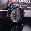 Прочный круглый корпус выполнен из пластика и алюминия. Тип механизма - электронный. Есть сплит-хронограф. В часы встроены 5 ежедневных будильников. Электролюминесцентная подсветка обеспечивает видимость данных в темноте. Вставлен алюминиевый безельБезельВнешний ободок, закрепляющий стекло. В спортивных часах так называется поворотное кольцо с делениями на циферблате, выполняет роль таймера – замеряет отрезки времени на шкале. Неподвижный безель – элемент декора. Однонаправленно вращающийся безель на дайверских часах позволяет фиксировать моменты погружения и выныривания на поверхность.. Водонепроницаемость составляет 100 WR.