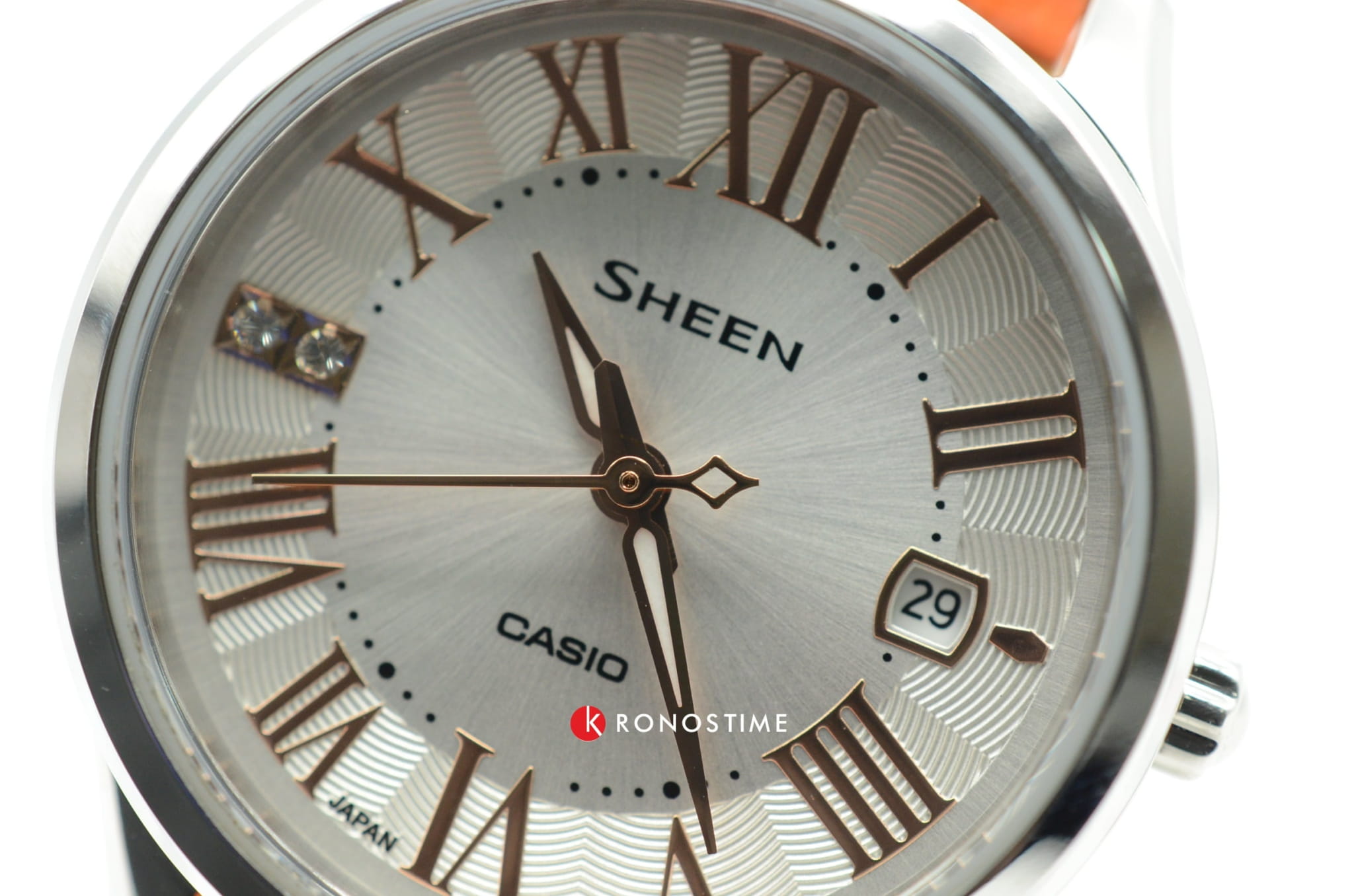 Наручные часы имеют элегантный дизайн, что делает их актуальным вариантом на долгие годы. Римские цифры наделяют модель оттенком винтажа, в качестве декора используются кристаллы Swarovski. Японский кварцевый механизм отличается высокой точностью хода. Яркая деталь – оранжевый ремешок из натуральной кожи. Возможности: отображение даты, люминесцентная подсветкаЛюминесцентное покрытиеПозволяет считывать показания времени в темноте. Производители наносят на стрелки, часовые индексы, безель или поверхность циферблата светонакопительный состав, дающий холодное свечение..