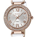 Изысканный аксессуар привлекает невероятным исполнением, минималистичный циферблат с римскими цифрами и утончёнными стрелками дополнен лаконичным узором. Изогнутый безельБезельВнешний ободок, закрепляющий стекло. В спортивных часах так называется поворотное кольцо с делениями на циферблате, выполняет роль таймера – замеряет отрезки времени на шкале. Неподвижный безель – элемент декора. Однонаправленно вращающийся безель на дайверских часах позволяет фиксировать моменты погружения и выныривания на поверхность. щедро усыпан стразами Swarovski, несколько кристаллов можно увидеть и на циферблате. Кварцевый высокоточный механизм. Белый ремешок из натуральной кожи. Корпус из хирургической стали с IP-покрытиемIP-покрытиеМетод ионного напыления. Демонстрирует повышенную устойчивость к истиранию, окислению и химическим веществам. Под воздействием высокого давления и температуры около 1500°C молекулы металла надёжно соединяются с частицами корпуса часов.. Минеральное стекло. Водонепроницаемость при давлении 5 бар. Прямоугольная апертура даты. Габариты: 36 x 41 x 8 мм.
