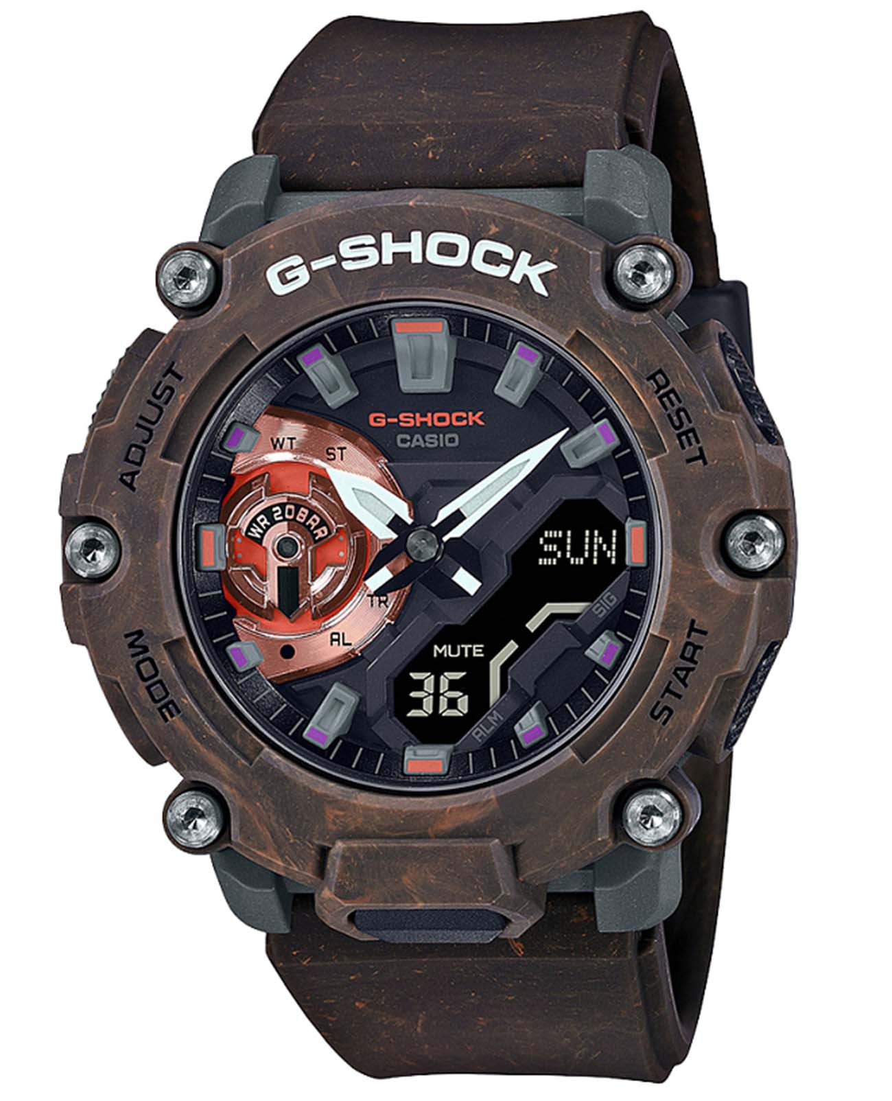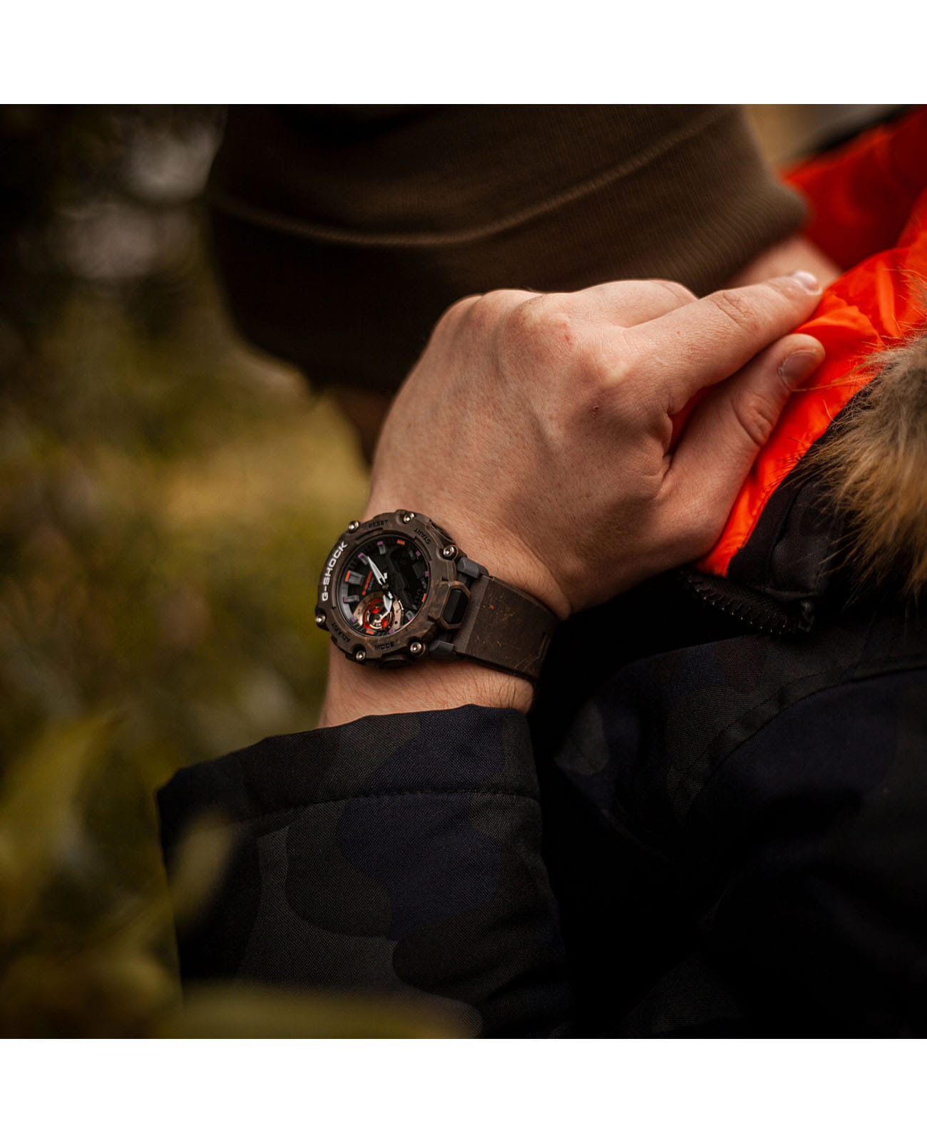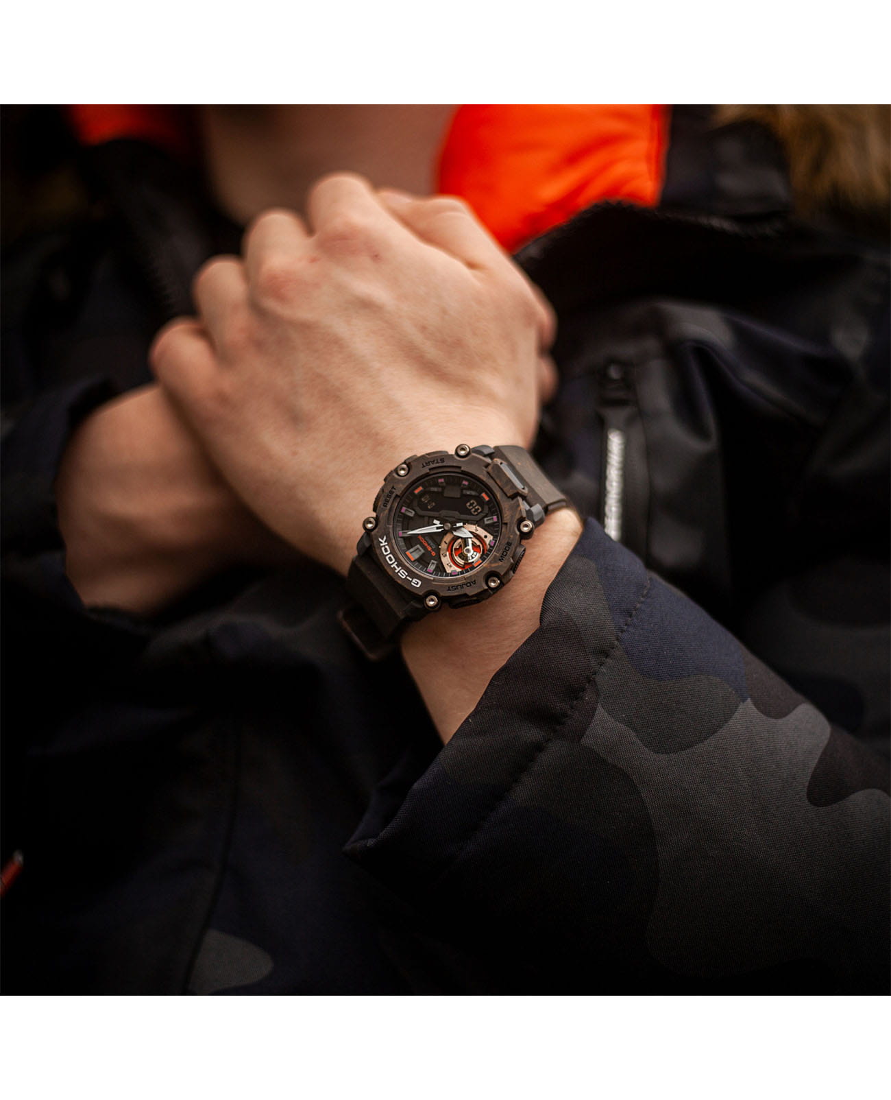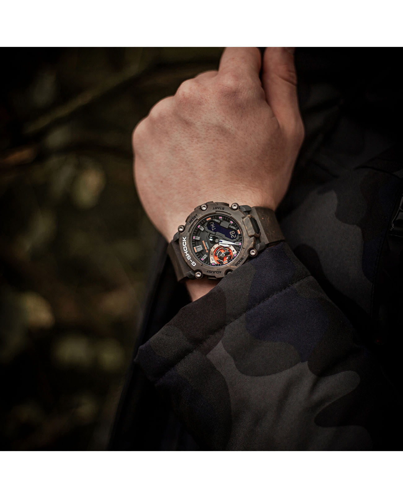 Мужские японские наручные часы Casio G-Shock GA-2200MFR-5A, электронный механизм с высокой точностью. Класс водозащиты: 200 метров, позволит плавать, нырять и заниматься другими водными видами спорта. Корпус часов изготовлен из карбона, цвета.