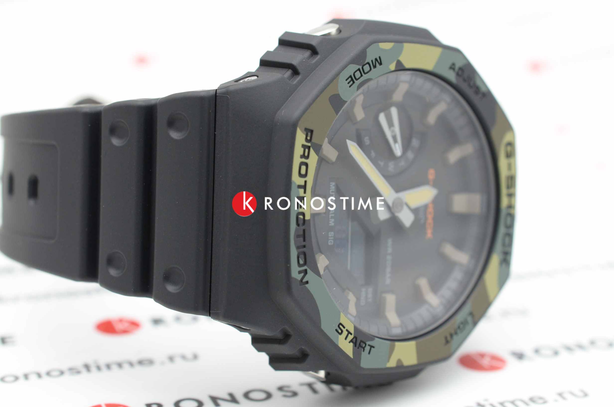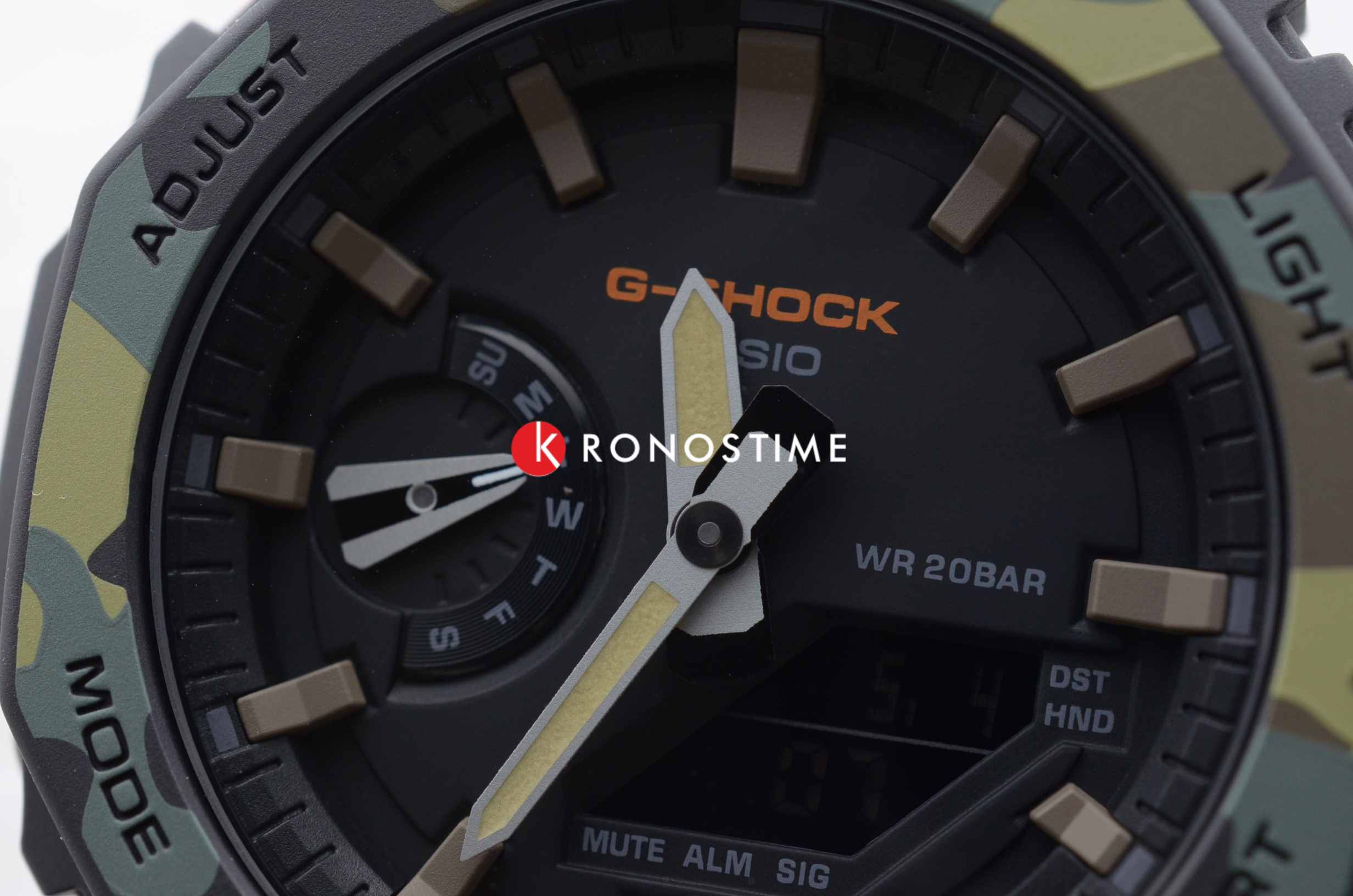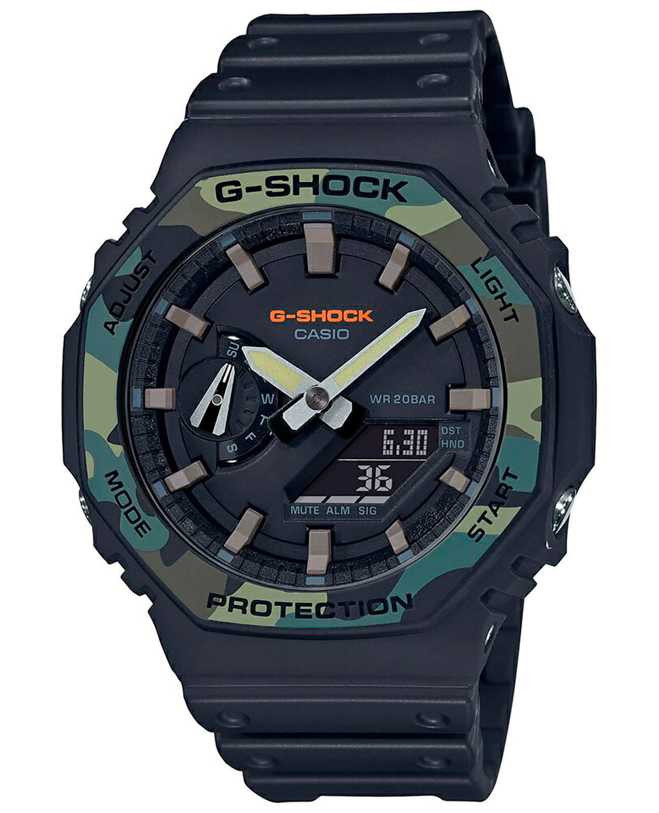 Аксессуар в темном цвете поможет дополнить повседневный образ. Внимание перенимает на себя безельБезельВнешний ободок, закрепляющий стекло. В спортивных часах так называется поворотное кольцо с делениями на циферблате, выполняет роль таймера – замеряет отрезки времени на шкале. Неподвижный безель – элемент декора. Однонаправленно вращающийся безель на дайверских часах позволяет фиксировать моменты погружения и выныривания на поверхность. с камуфляжным принтом, выполненный в форме октагона. Благодаря конструкции Carbon Core GuardCarbon Core Guard Новейшая структура корпуса, разработанная Casio. Полиуретановая пластина дополнительно усилена карбоновыми вставками, что придаёт специальную защиту от механических повреждений. Карбон отличается лёгкостью и прочностью. для тонкого ударопрочного корпусаУдаропрочный корпусМеханизм заключён в корпус, выполненный из современных материалов, устойчивых к ударам, механическим повреждениям и падению с высоты: инновационный пластик, карбон, нержавеющая сталь, титан. (11,8 мм) часы получили невероятную лёгкость, повышенную устойчивость к падению, повреждениям. Обновлённое крепление полимерного ремешка позволяет менять его в считанные секунды. Японский кварцевый механизм получает энергию от батарейки, рассчитанной на 3 года работы. ЛюминесцентнаяЛюминесцентное покрытиеПозволяет считывать показания времени в темноте. Производители наносят на стрелки, часовые индексы, безель или поверхность циферблата светонакопительный состав, дающий холодное свечение. и светодиодная подсветкаСветодиодная подсветкаСветодиодная или LED-подсветка обеспечивает появление яркого холодного свечения за счёт LED-элементов - маленьких лампочек. Они потребляют минимальное количество энергии, чаще всего можно встретить 1 светодиод, в нижней части циферблата.. Минеральное стекло. Сохранение водонепроницаемости до 10 бар. Будильник, хронографХронографФункция позволяет измерять отрезки времени с особой точностью: часы, минуты, секунды. Верным признаком хронографа является наличие на циферблате 3 дополнительных окошек-счётчиков., таймер, мировое времяМировое время Полезное часовое усложнение, отображающее время в основных городах и известных областях по всему миру, оно связано с часовыми поясами, удобно для путешественников и бизнесменов. , секундомер, вечный календарьВечный календарьКлассическое часовое усложнение, представляющее собой календарь, рассчитанный на несколько лет вперёд (стандартно – до 2099 года). Определяет текущую дату, день недели, месяц.. Габариты: 48,5 x 45,4 x 11,8 мм.