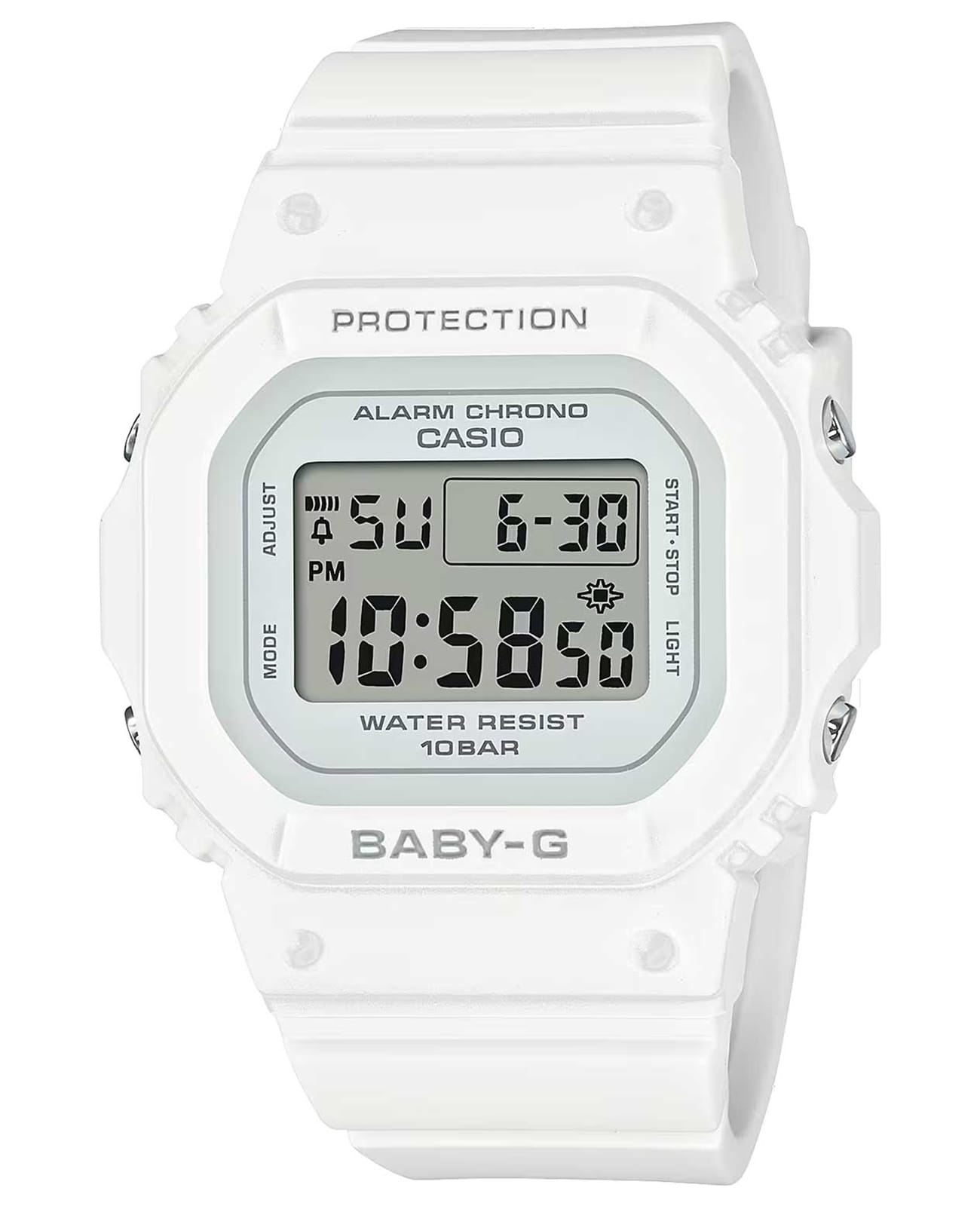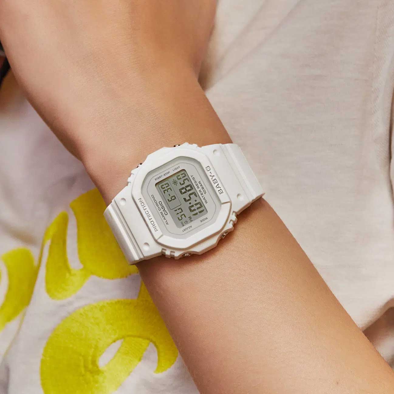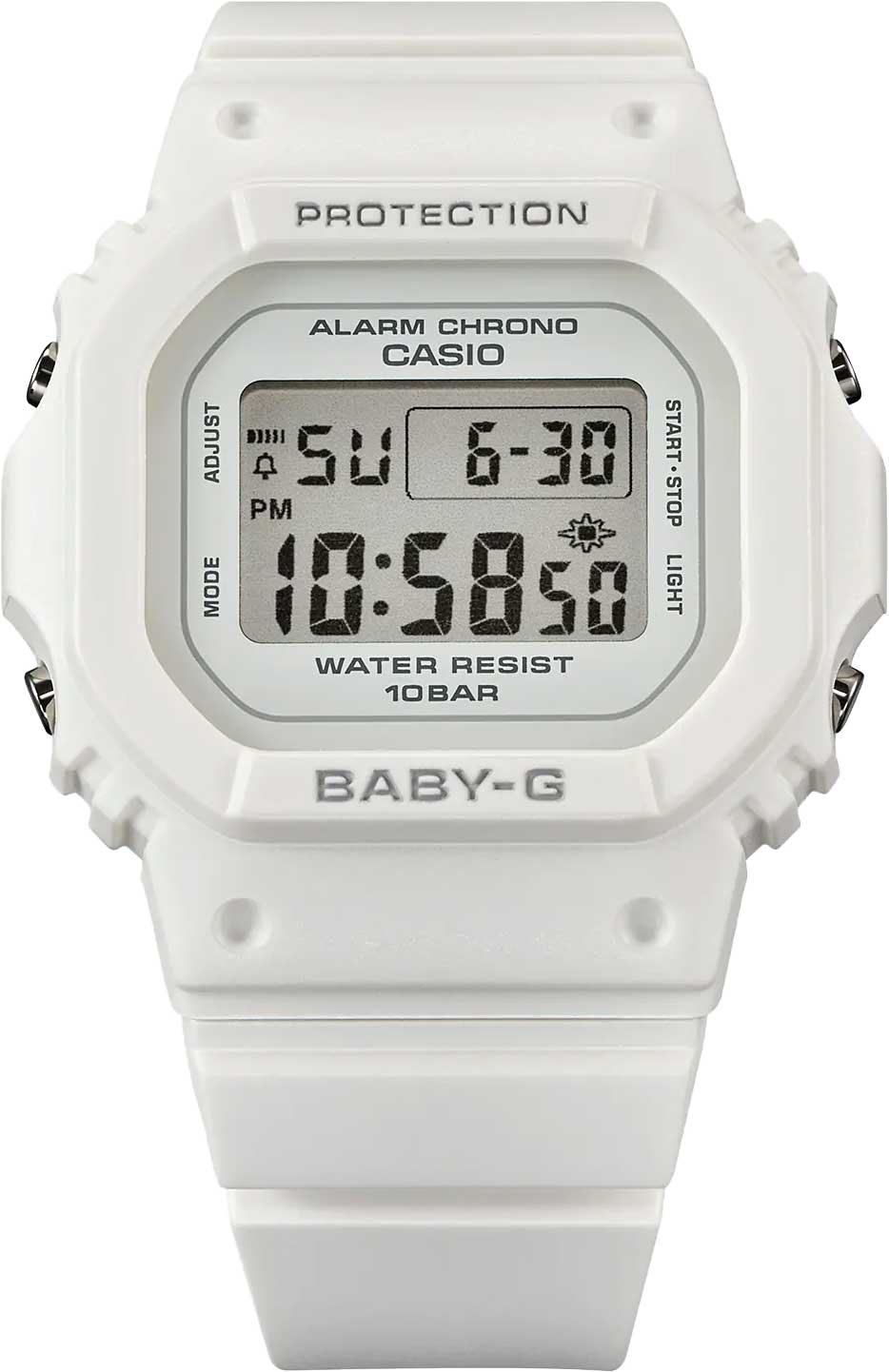 Женские противоударные японские часы Casio Baby-G BGD-565-7E, кварцевый механизм с высокой точностью. Класс водозащиты: 100 метров, позволит плавать, нырять и заниматься другими водными видами спорта. Корпус часов изготовлен из пластика, белого цвета.
