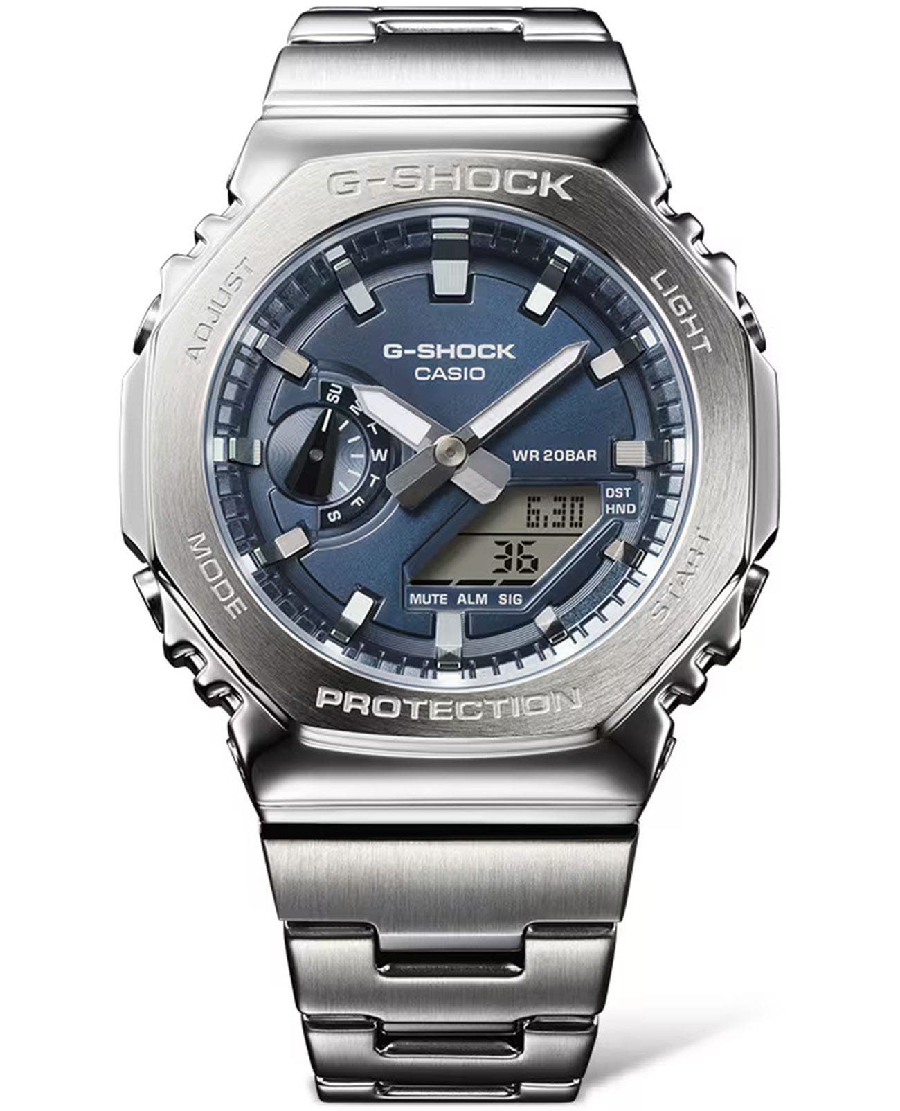 Японские ударопрочныеУдаропрочный корпусМеханизм заключён в корпус, выполненный из современных материалов, устойчивых к ударам, механическим повреждениям и падению с высоты: инновационный пластик, карбон, нержавеющая сталь, титан. мужские часы-хронографХронографФункция позволяет измерять отрезки времени с особой точностью: часы, минуты, секунды. Верным признаком хронографа является наличие на циферблате 3 дополнительных окошек-счётчиков. Casio G-Shock GM-2110D-2B в стальном корпусе. Минеральное стеклоМинеральное стеклоМинеральное стекло представляет собой искусственно выращенный минерал кварца. Такое стекло отличается особой устойчивостью к повреждениям и царапинам. Уступает по некоторым качествам сапфировому стеклу. устойчивое к появлению царапин, обладающее высокой прозрачностью. Сверхмощная двойная подсветка. При нажатии на кнопку подсветки циферблат часов освещает светодиод, а также отдельно подсвечивается цифровой дисплей. На стрелки часов нанесено NeobriteПодсветка NeobriteИспользование светонакопительных составов на основе сульфида цинка или алюмината стронция, яркий свет можно наблюдать на протяжении 6-10 часов после «зарядки» часов около источника света.-покрытие. Полный автокалендарь (до 2099 года). Включение/выключение звукового сигнала нажатия кнопки. 12/24-часовой формат времени. Мировое время Мировое время Полезное часовое усложнение, отображающее время в основных городах и известных областях по всему миру, оно связано с часовыми поясами, удобно для путешественников и бизнесменов. 31 часовой пояс (48 городов + всемирное координированное время), переход на летнее время вкл./выкл. СекундомерСекундомерСекундоме́р — прибор, способный измерять интервалы времени с точностью до долей секунды.. ТаймерТаймерОтсчитывает секунды в обратном направлении в заданном интервале времени.. 5 ежедневных будильников. Почасовой сигнал времени. Класс водозащиты: 200 метров, позволит плавать, нырять и заниматься другими водными видами спорта. Стальной браслет на раскладной застёжкеРаскладная застёжкаТакой тип застёжки используется только на браслетах из металла. Она никогда не раскрывается полностью, происходит разделение на 2 и более частей. Раскладывающая застёжка снизит вероятность потери часов к минимуму..