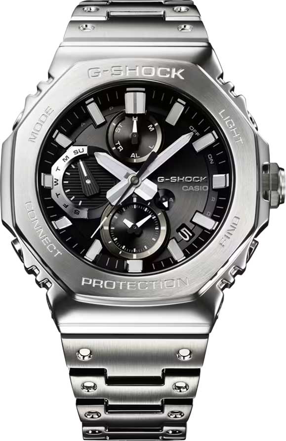 Модель Casio G-SHOCK GMC-B2100D-1A сочетает элегантность металлического корпуса и передовые технологии. Восьмиугольный безельБезельВнешний ободок, закрепляющий стекло. В спортивных часах так называется поворотное кольцо с делениями на циферблате, выполняет роль таймера – замеряет отрезки времени на шкале. Неподвижный безель – элемент декора. Однонаправленно вращающийся безель на дайверских часах позволяет фиксировать моменты погружения и выныривания на поверхность., вдохновленный оригинальной моделью DW-5000C 1983 года, придает часам современный минималистичный стиль. Корпус и браслет изготовлены из нержавеющей стали, а амортизирующие элементы из мелкозернистой смолы защищают механизм от ударов и вибраций, обеспечивая ударопрочностьУдаропрочный корпусМеханизм заключён в корпус, выполненный из современных материалов, устойчивых к ударам, механическим повреждениям и падению с высоты: инновационный пластик, карбон, нержавеющая сталь, титан.. Часы оснащены солнечным питанием Tough SolarTough SolarТехнология основана на подзарядке аккумулятора от источника солнечного света, специальная панель улавливает солнечные лучи и преобразует их в энергию для работы часов. Достаточно пары минут нахождения на солнце для функционирования часов в течении суток., которое позволяет заряжать аккумулятор от солнечного света, а также Bluetooth®-синхронизациейBluetoothСовременная технология, позволяющая синхронизировать часы с телефоном и переносить данные. Часы с Bluetooth расширяют возможности вашего смартфона и делают его использование ещё более удобным., обеспечивающей автоматическую корректировку времени и управление настройками через приложение CASIO WATCHES. Дополнительные функции включают мировое времяМировое время Полезное часовое усложнение, отображающее время в основных городах и известных областях по всему миру, оно связано с часовыми поясами, удобно для путешественников и бизнесменов. , секундомерСекундомерСекундоме́р — прибор, способный измерять интервалы времени с точностью до долей секунды., таймер обратного отсчетаТаймерОтсчитывает секунды в обратном направлении в заданном интервале времени., будильникиБудильникБуди́льник — часы, в заданный момент времени подающие звуковой, световой и/или в редких случаях другой сигнал. и светодиодную подсветкуСветодиодная подсветкаСветодиодная или LED-подсветка обеспечивает появление яркого холодного свечения за счёт LED-элементов - маленьких лампочек. Они потребляют минимальное количество энергии, чаще всего можно встретить 1 светодиод, в нижней части циферблата.. Водонепроницаемость до 200 метров делает модель подходящей для плавания и активного отдыха. Casio G-SHOCK GMC-B2100D-1A — это надежный и стильный аксессуар, идеально сочетающий прочность, технологичность и современный дизайн.