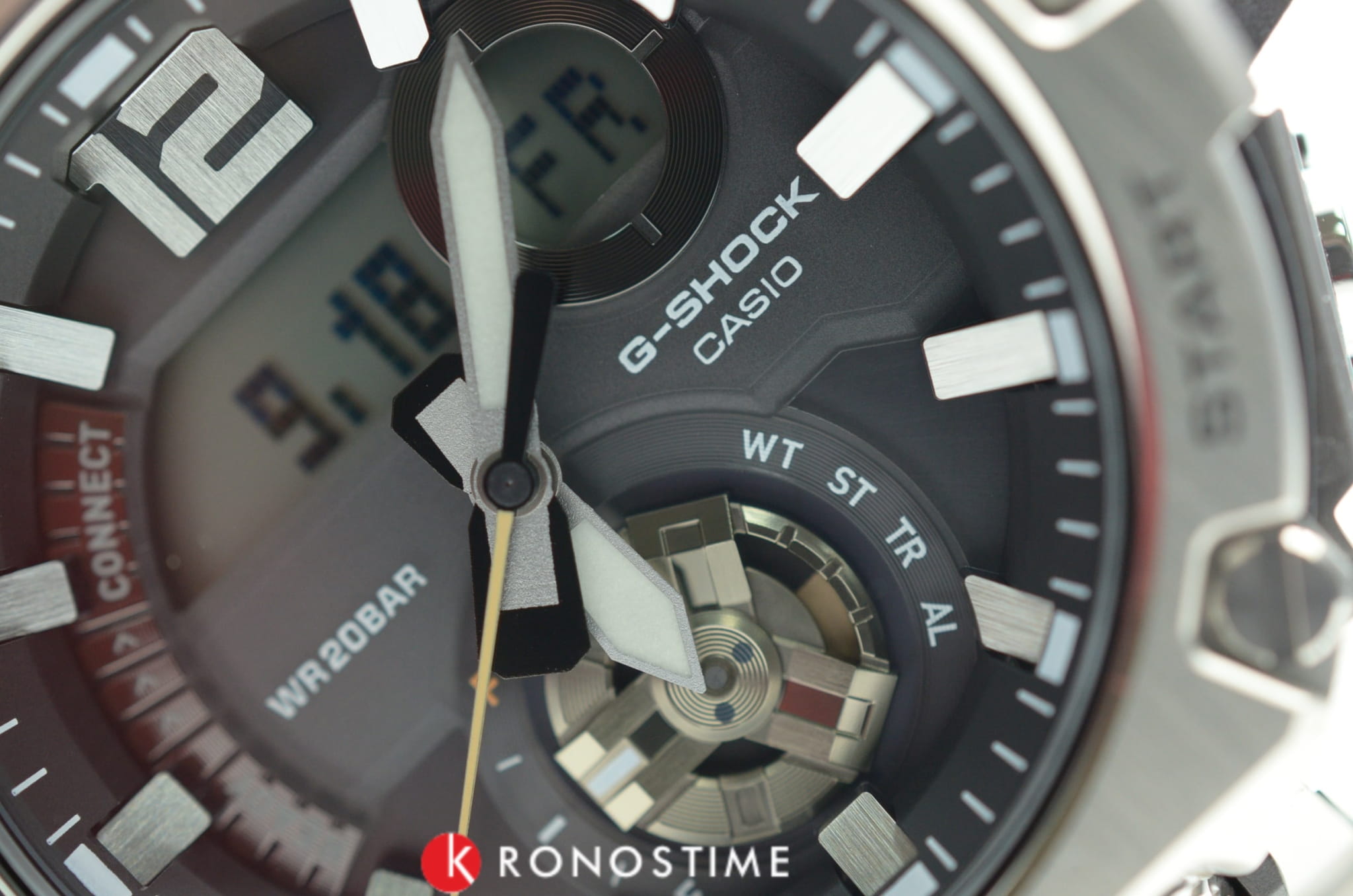 Корпус имеет структуру Carbon Core GuardCarbon Core Guard Новейшая структура корпуса, разработанная Casio. Полиуретановая пластина дополнительно усилена карбоновыми вставками, что придаёт специальную защиту от механических повреждений. Карбон отличается лёгкостью и прочностью., что говорит о повышенной ударопрочности. БезельБезельВнешний ободок, закрепляющий стекло. В спортивных часах так называется поворотное кольцо с делениями на циферблате, выполняет роль таймера – замеряет отрезки времени на шкале. Неподвижный безель – элемент декора. Однонаправленно вращающийся безель на дайверских часах позволяет фиксировать моменты погружения и выныривания на поверхность. и браслет изготовлены из стали 316L. Японский кварцевый механизм отличается высокой точностью хода 15 +/- секунд в месяц. Часы оснащены инновационной технологией , синхронизация со смартфоном происходит с помощью BluetoothBluetoothСовременная технология, позволяющая синхронизировать часы с телефоном и переносить данные. Часы с Bluetooth расширяют возможности вашего смартфона и делают его использование ещё более удобным.. Возможности: двойная автоматическая подсветка, мировое времяМировое время Полезное часовое усложнение, отображающее время в основных городах и известных областях по всему миру, оно связано с часовыми поясами, удобно для путешественников и бизнесменов. , будильник, хронографХронографФункция позволяет измерять отрезки времени с особой точностью: часы, минуты, секунды. Верным признаком хронографа является наличие на циферблате 3 дополнительных окошек-счётчиков., календарь, таймер.