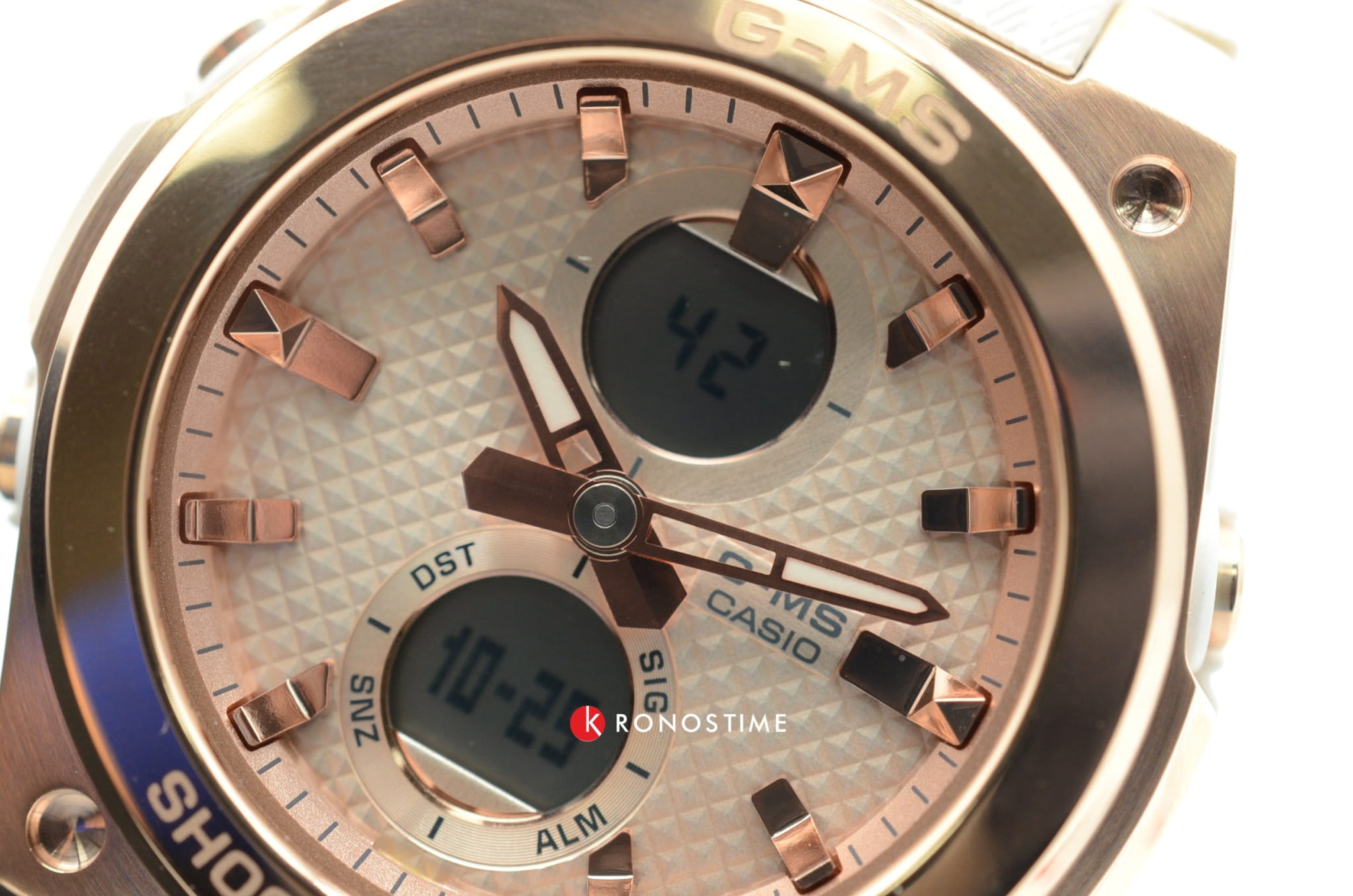 Аксессуар с белым фактурным циферблатом наделён противоударным корпусомУдаропрочный корпусМеханизм заключён в корпус, выполненный из современных материалов, устойчивых к ударам, механическим повреждениям и падению с высоты: инновационный пластик, карбон, нержавеющая сталь, титан. из полимерного пластика. Для усиления устойчивости к ударам безельБезельВнешний ободок, закрепляющий стекло. В спортивных часах так называется поворотное кольцо с делениями на циферблате, выполняет роль таймера – замеряет отрезки времени на шкале. Неподвижный безель – элемент декора. Однонаправленно вращающийся безель на дайверских часах позволяет фиксировать моменты погружения и выныривания на поверхность. сделан из хирургической стали 316L. IP-покрытиеIP-покрытиеМетод ионного напыления. Демонстрирует повышенную устойчивость к истиранию, окислению и химическим веществам. Под воздействием высокого давления и температуры около 1500°C молекулы металла надёжно соединяются с частицами корпуса часов. цвета розового золота защищает от царапин. Японский кварцевый механизм. Полимерный ремешок с узорчатой поверхностью. Минеральное стекло с закалкой. Водозащита до 10 бар. ЛюминесцентнаяЛюминесцентное покрытиеПозволяет считывать показания времени в темноте. Производители наносят на стрелки, часовые индексы, безель или поверхность циферблата светонакопительный состав, дающий холодное свечение. и светодиодная подсветкаСветодиодная подсветкаСветодиодная или LED-подсветка обеспечивает появление яркого холодного свечения за счёт LED-элементов - маленьких лампочек. Они потребляют минимальное количество энергии, чаще всего можно встретить 1 светодиод, в нижней части циферблата.. Будильник, таймер, секундомер с точностью в 1/100 секунды, хронографХронографФункция позволяет измерять отрезки времени с особой точностью: часы, минуты, секунды. Верным признаком хронографа является наличие на циферблате 3 дополнительных окошек-счётчиков., ежечасный сигнал, мировое времяМировое время Полезное часовое усложнение, отображающее время в основных городах и известных областях по всему миру, оно связано с часовыми поясами, удобно для путешественников и бизнесменов. . Габариты: 45,1 x 40,3 x 12,4 мм.