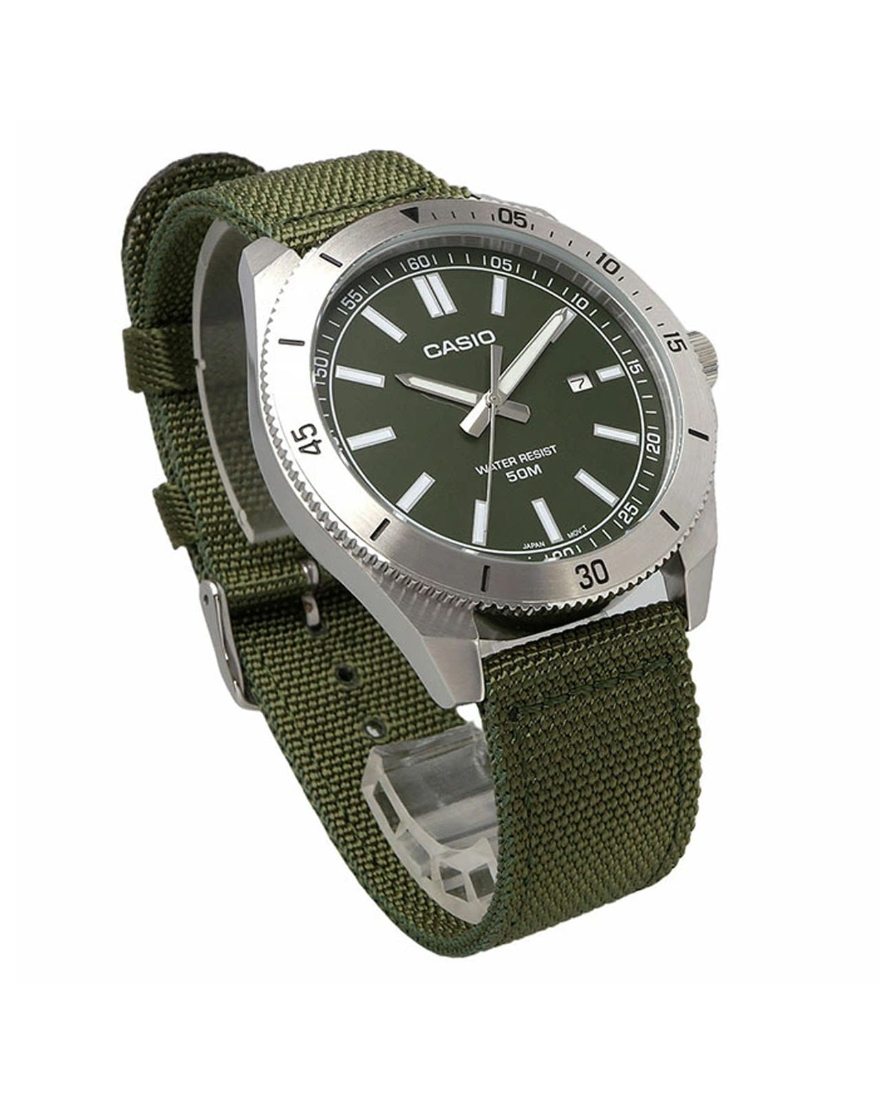 Спортивные японские мужские часы Casio Collection MTP-B155C-3EV с минеральным стекломМинеральное стеклоМинеральное стекло представляет собой искусственно выращенный минерал кварца. Такое стекло отличается особой устойчивостью к повреждениям и царапинам. Уступает по некоторым качествам сапфировому стеклу., устойчивым к мелким механическим повреждениям. Корпус часов изготовлен из нержавеющей стали. Вращающийся стальной безельБезельВнешний ободок, закрепляющий стекло. В спортивных часах так называется поворотное кольцо с делениями на циферблате, выполняет роль таймера – замеряет отрезки времени на шкале. Неподвижный безель – элемент декора. Однонаправленно вращающийся безель на дайверских часах позволяет фиксировать моменты погружения и выныривания на поверхность.. Стрелки и метки с люминесцентным покрытиемЛюминесцентное покрытиеПозволяет считывать показания времени в темноте. Производители наносят на стрелки, часовые индексы, безель или поверхность циферблата светонакопительный состав, дающий холодное свечение.. Задняя крышка с винтовым фиксатором. Батарейка рассчитана на 3 года. Окошко даты в положении 3 часа. Класс водозащиты: 50 метров, позволит защитить корпус от случайных брызг или капель дождя. Тканевый ремешок на стандартной застежке.