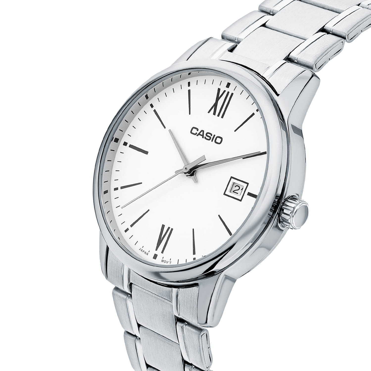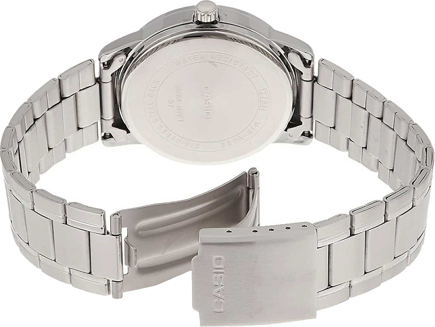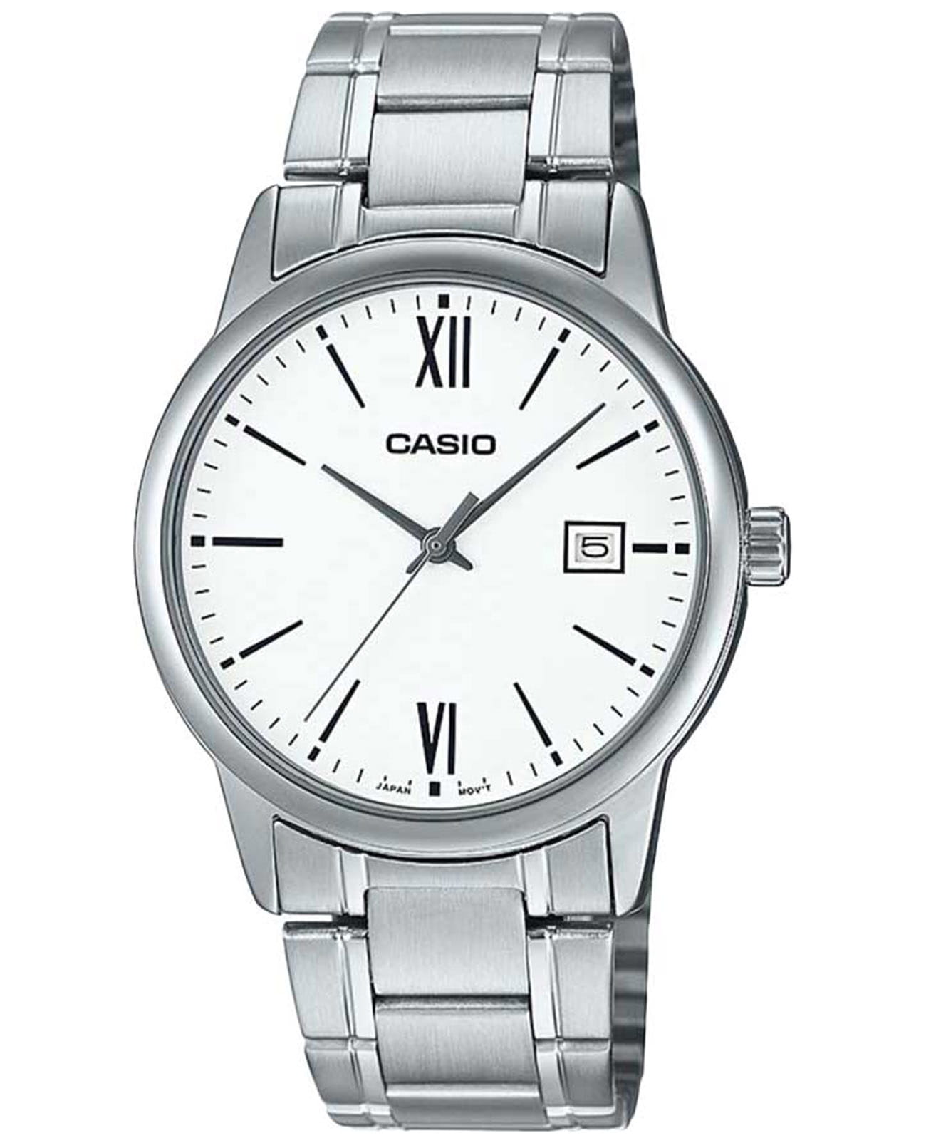 Японские мужские наручные часы с минеральным стекломМинеральное стеклоМинеральное стекло представляет собой искусственно выращенный минерал кварца. Такое стекло отличается особой устойчивостью к повреждениям и царапинам. Уступает по некоторым качествам сапфировому стеклу. Casio Collection MTP-V002D-7B3, кварцевый механизм с высокой точностью. Класс водозащиты: 30 метров, позволит защитить корпус от случайных брызг или капель дождя. Корпус часов изготовлен из стали. Стальной браслет на раскладной застёжкеРаскладная застёжкаТакой тип застёжки используется только на браслетах из металла. Она никогда не раскрывается полностью, происходит разделение на 2 и более частей. Раскладывающая застёжка снизит вероятность потери часов к минимуму.. Метки в виде штрихов и двух римских цифр.